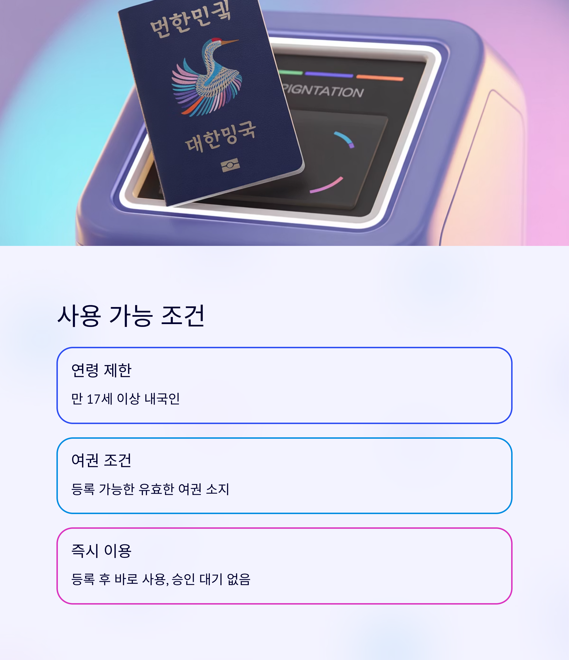 스마트패스는 만 17세 이상 내국인, 그리고 등록 가능한 유효한 여권을 소지한 경우 사용할 수 있어요. 등록 후 바로 이용 가능하며, 별도의 승인 대기 시간이 없습니다.