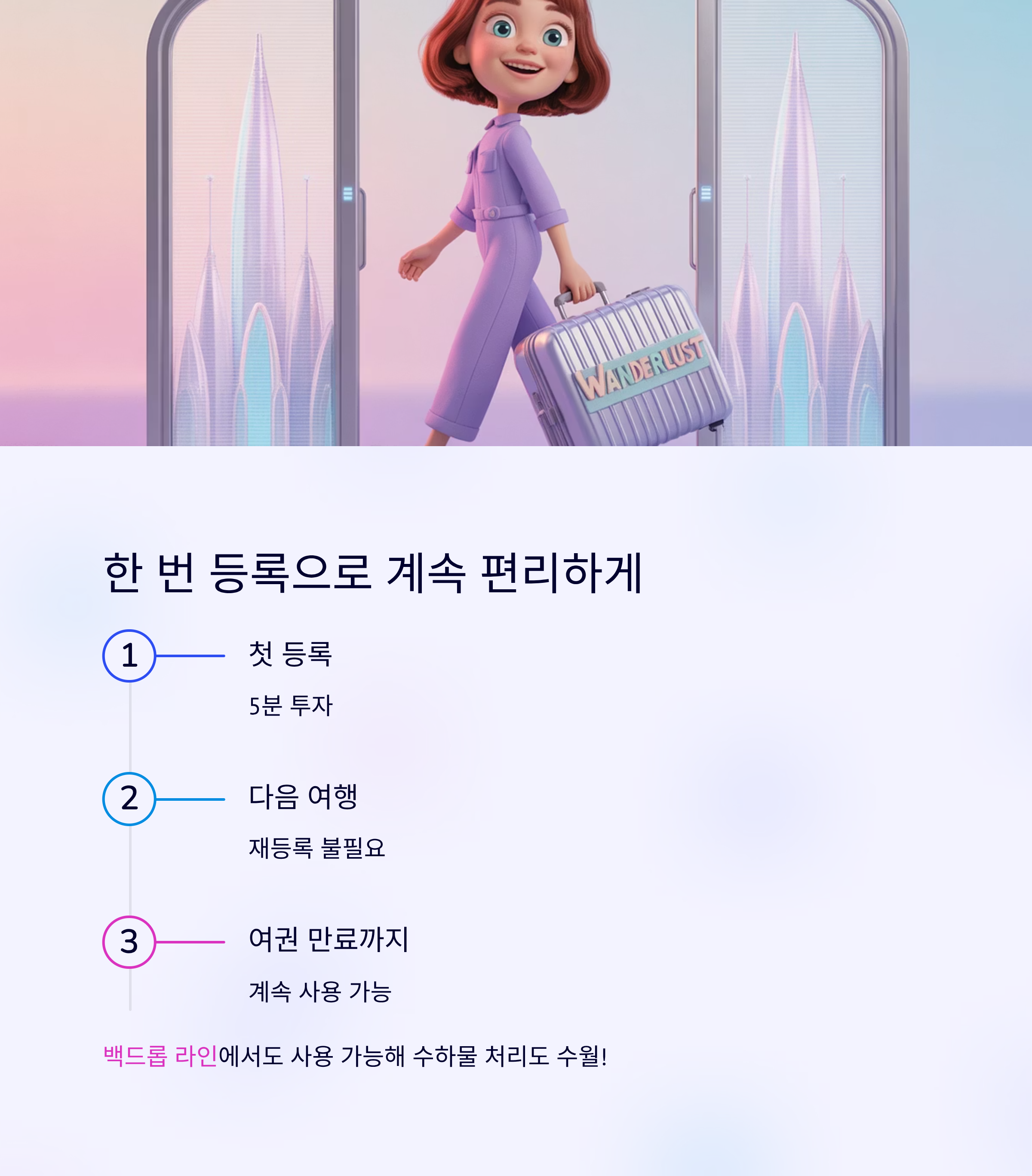 한 번 등록해두면 여권 만료 전까지 계속 사용할 수 있어서, 다음 여행 때도 따로 등록할 필요가 없어요. 백드롭 라인에서도 사용 가능해 수하물 처리도 한결 수월해진답니다.