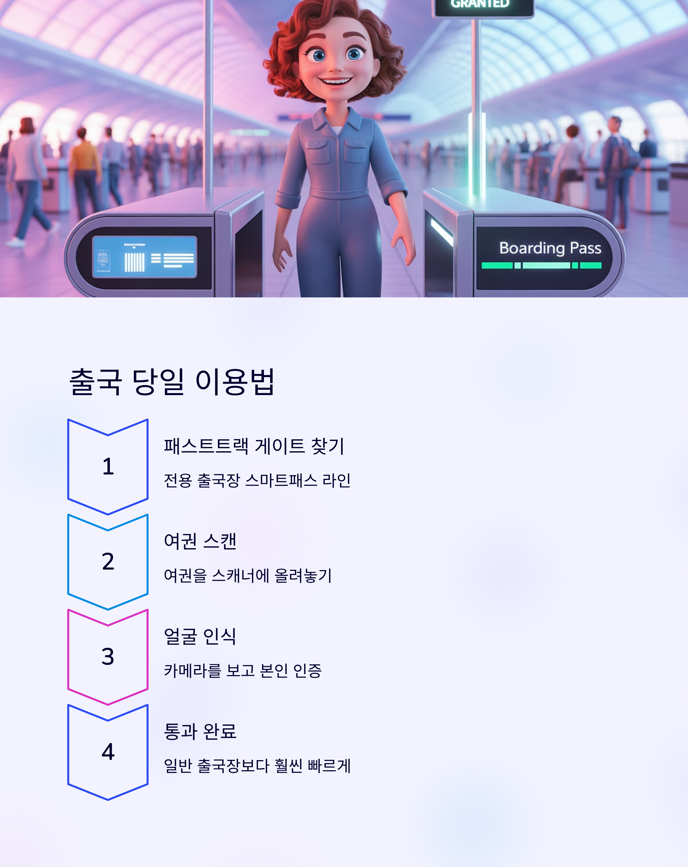 스마트패스는 전용 출국장에 마련된 패스트트랙 게이트에서 사용할 수 있습니다. 여권만 스캔하면 얼굴 인식으로 본인 인증 후 바로 통과할 수 있어요. 일반 출국장보다 훨씬 빠르기 때문에 시간 절약이 큰 장점이죠.