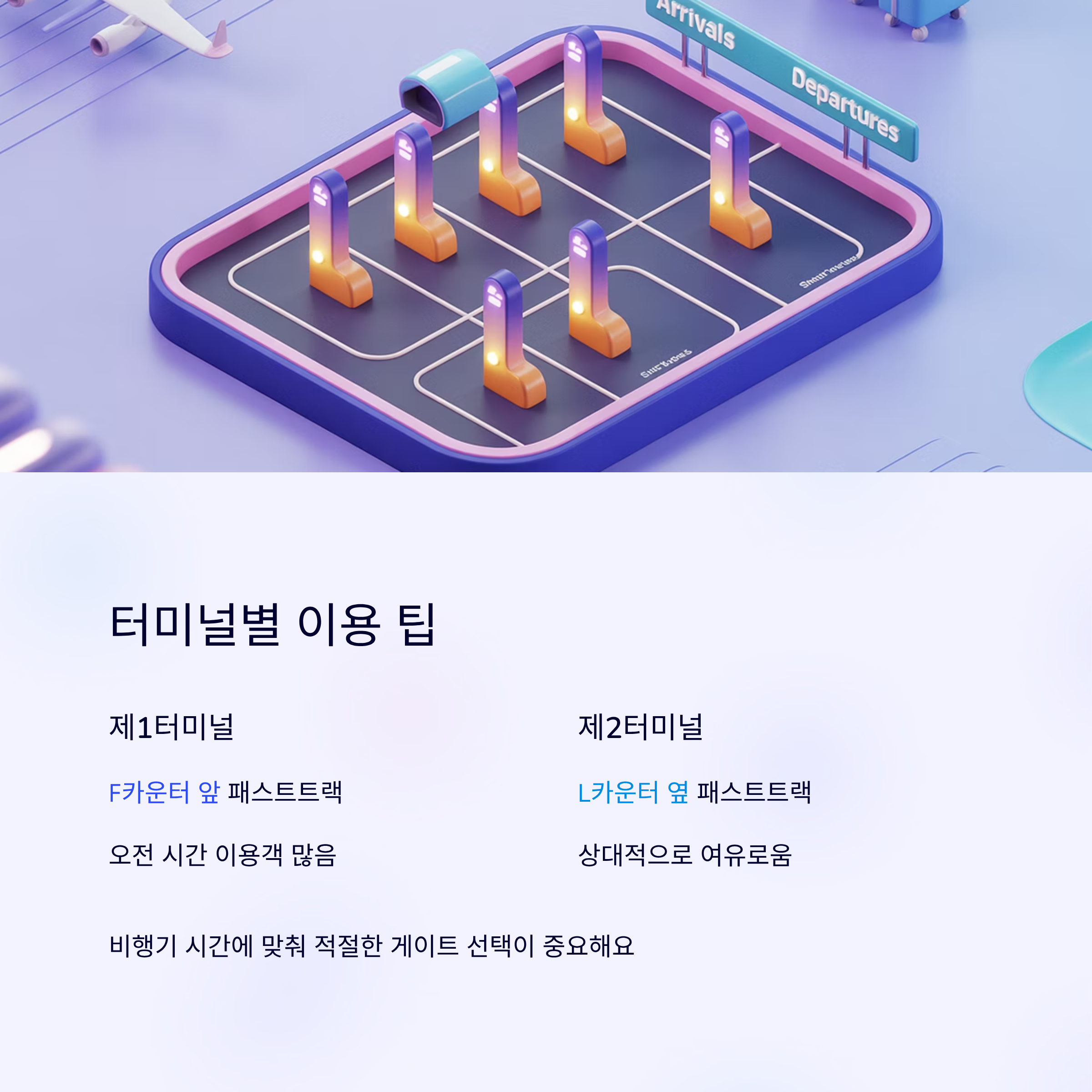 | 제1터미널 | F카운터 앞 패스트트랙 | 오전 시간 이용객 많음 |