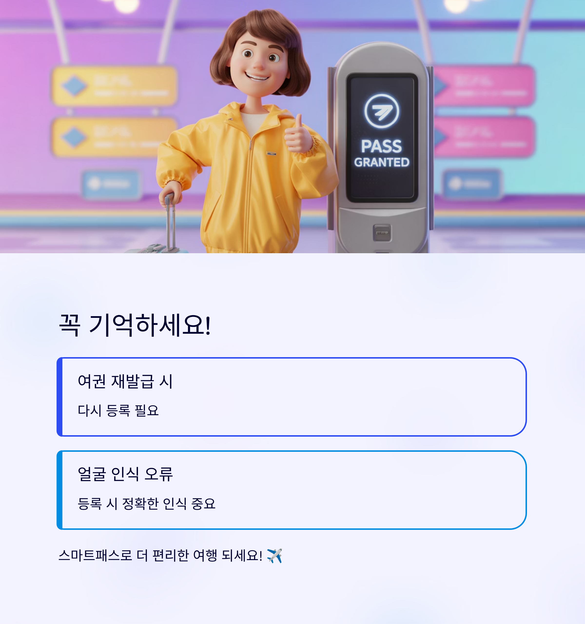 간혹 여권 재발급 후 스마트패스가 작동하지 않는 경우도 있어요. 이럴 땐 다시 등록이 필요합니다. 또, 얼굴 인식이 잘 되지 않으면 오류가 날 수 있으니 등록 시 정확하게 얼굴을 인식시키는 게 중요해요.
