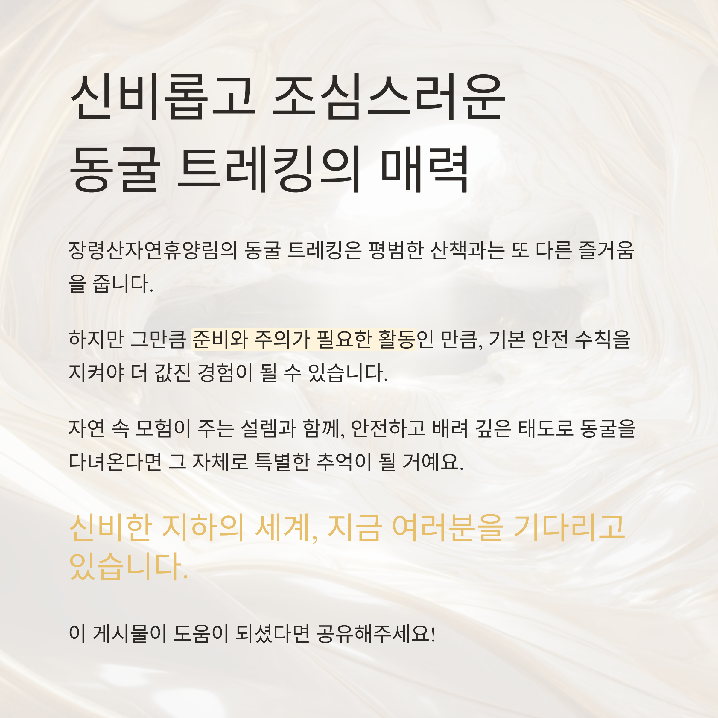 신비로운 동굴을 따라 걷는 시간은 일상의 스트레스를 잊게 만들지만, 주의할 점도 많은 코스이기 때문에 제대로 알고 안전하게 즐기는 것이 중요합니다. 오늘은 장령산자연휴양림에서 동굴 트레킹을 안전하게 즐기는 법을 정리해드릴게요.