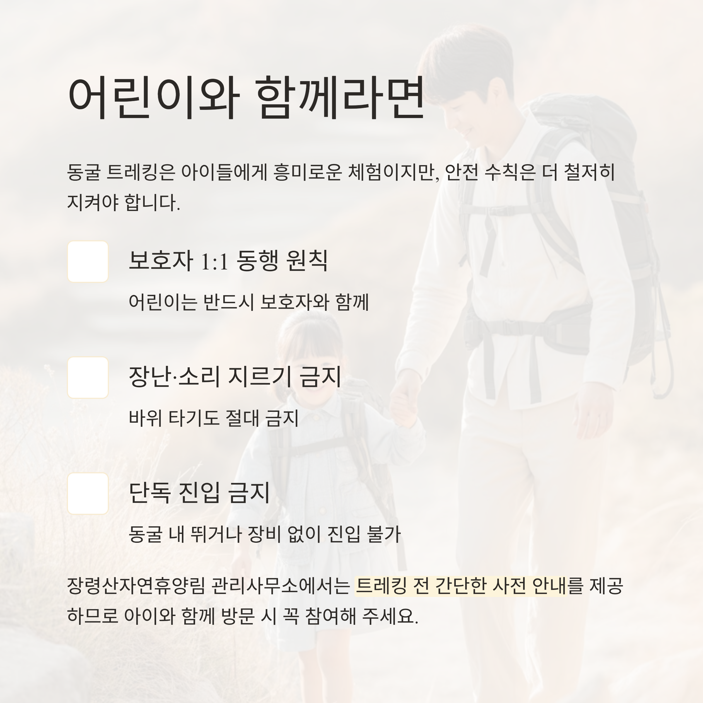 동굴 트레킹은 아이들에게 흥미로운 체험이지만, 안전 수칙은 더 철저히 지켜야 해요.