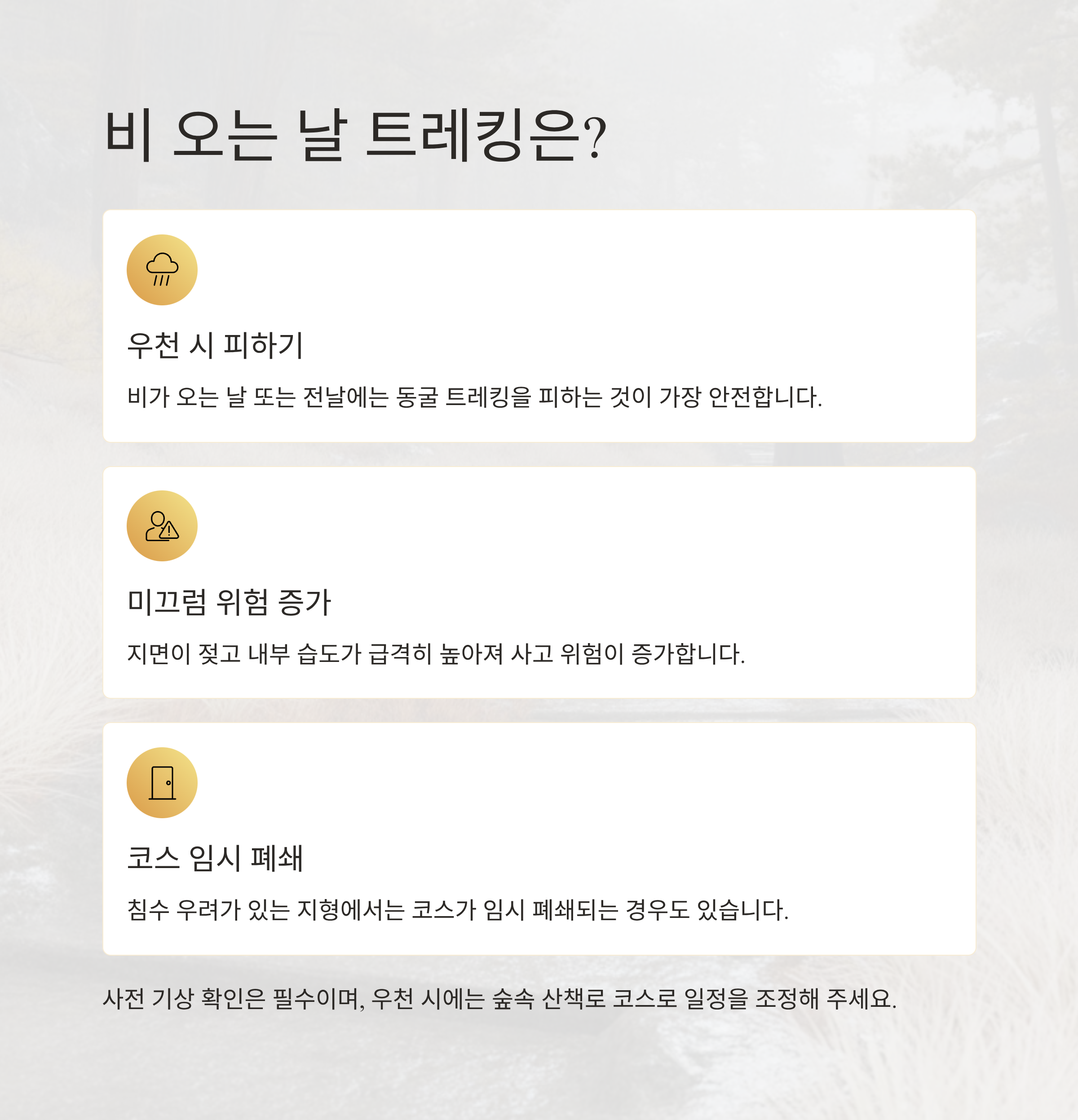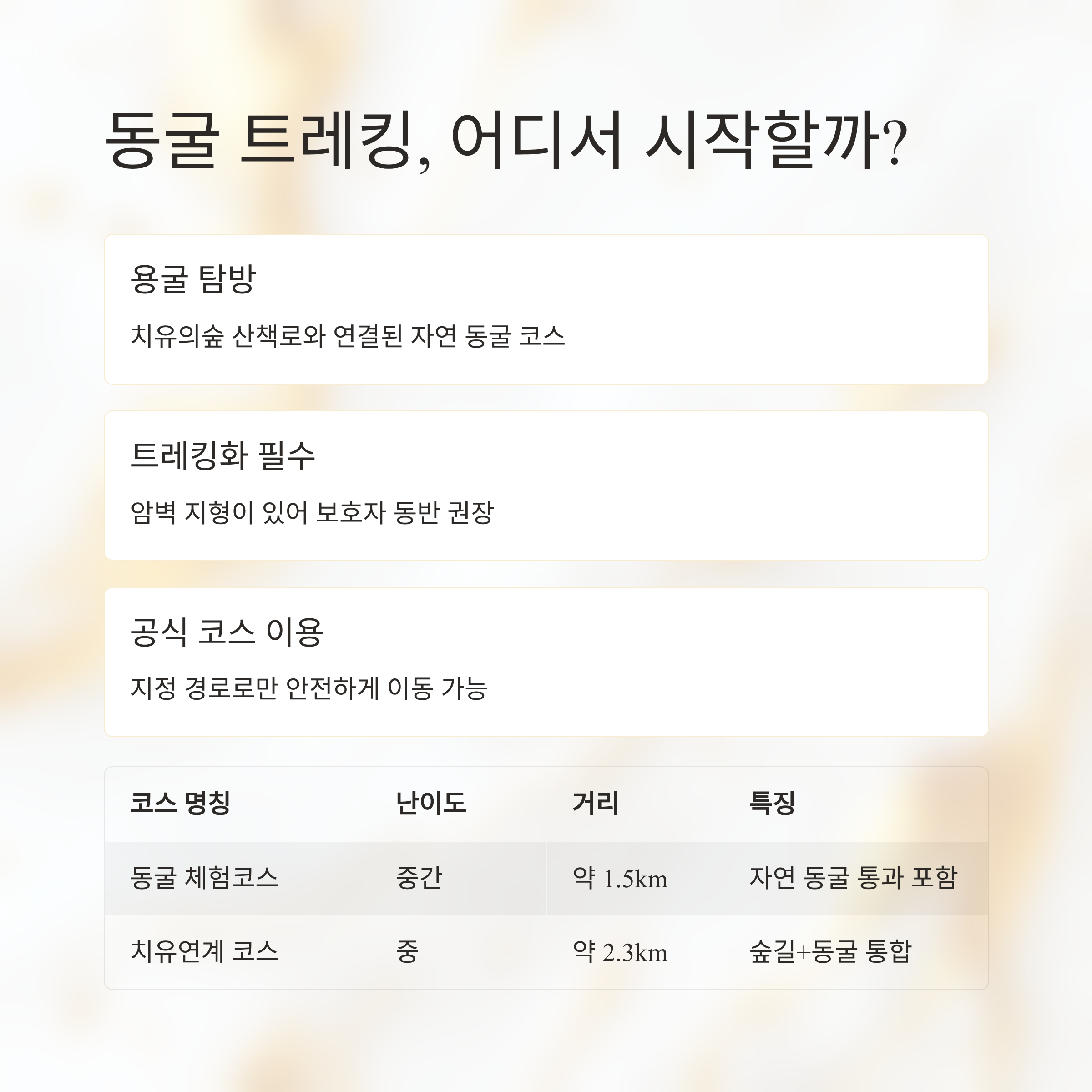 | 동굴 체험코스 | 중간 | 약 1.5km | 자연 동굴 통과 포함 |