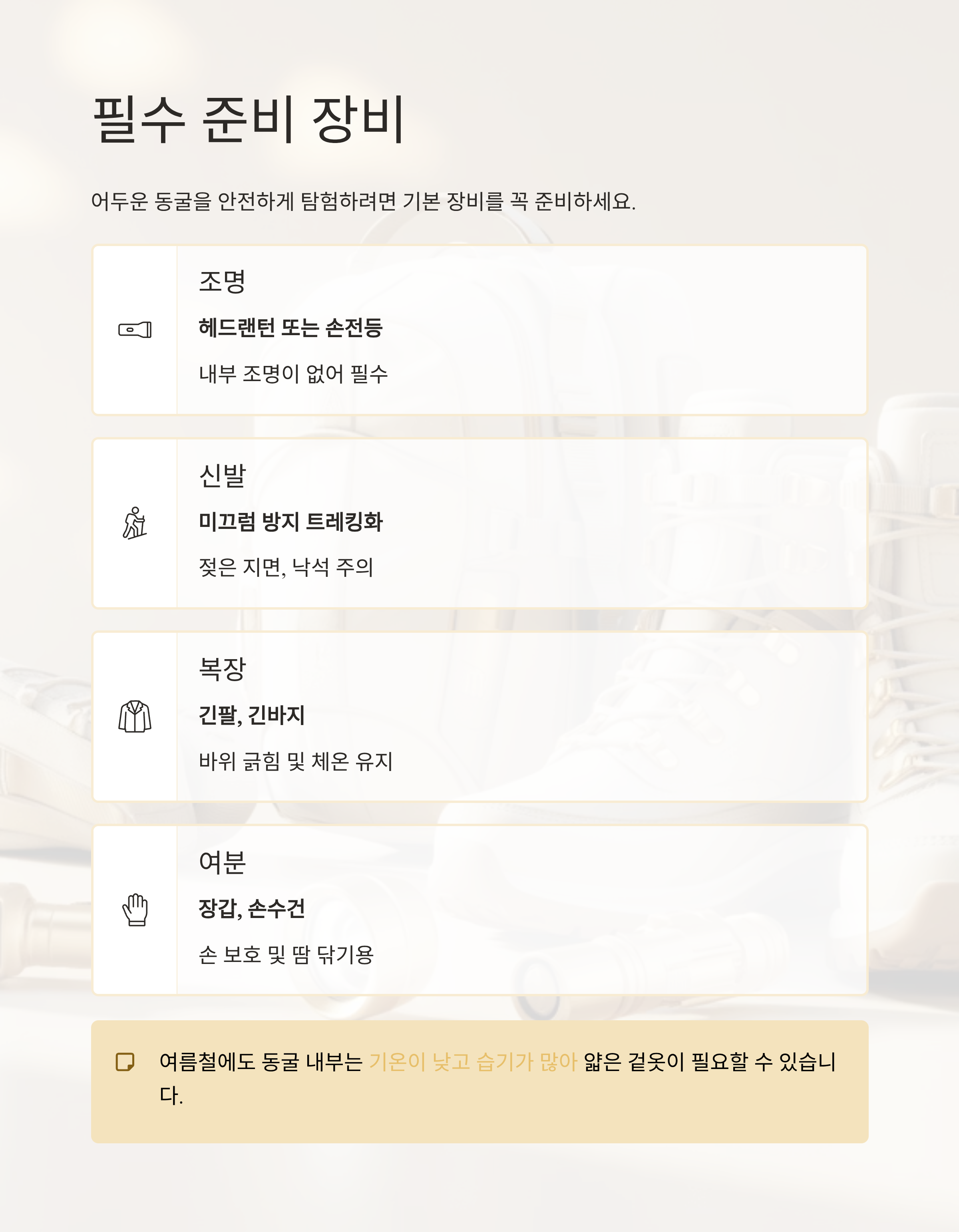 어두운 동굴을 안전하게 탐험하려면 기본 장비를 꼭 준비하셔야 합니다.