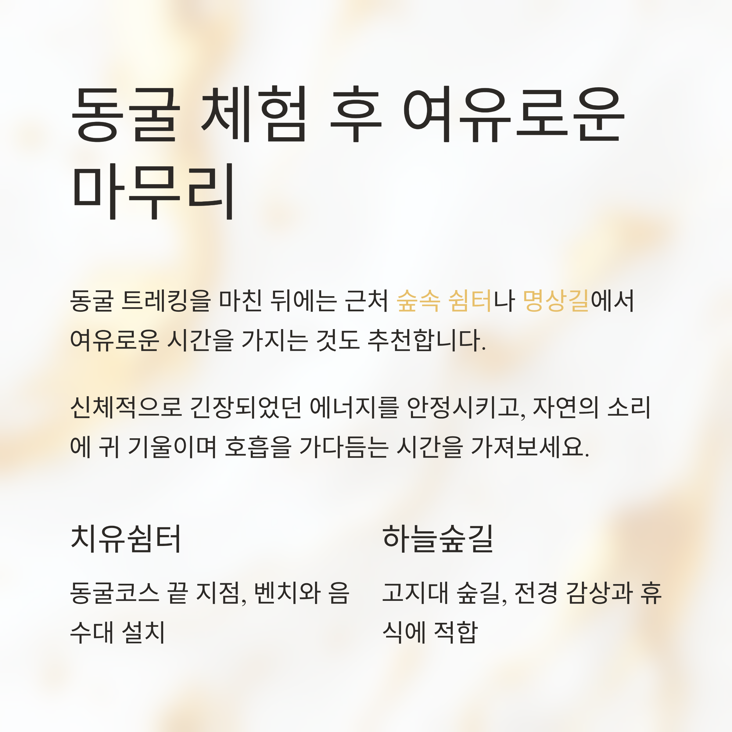 동굴 트레킹을 마친 뒤에는 근처에 위치한 숲속 쉼터나 명상길에서 여유로운 시간을 가지는 것도 추천해요.