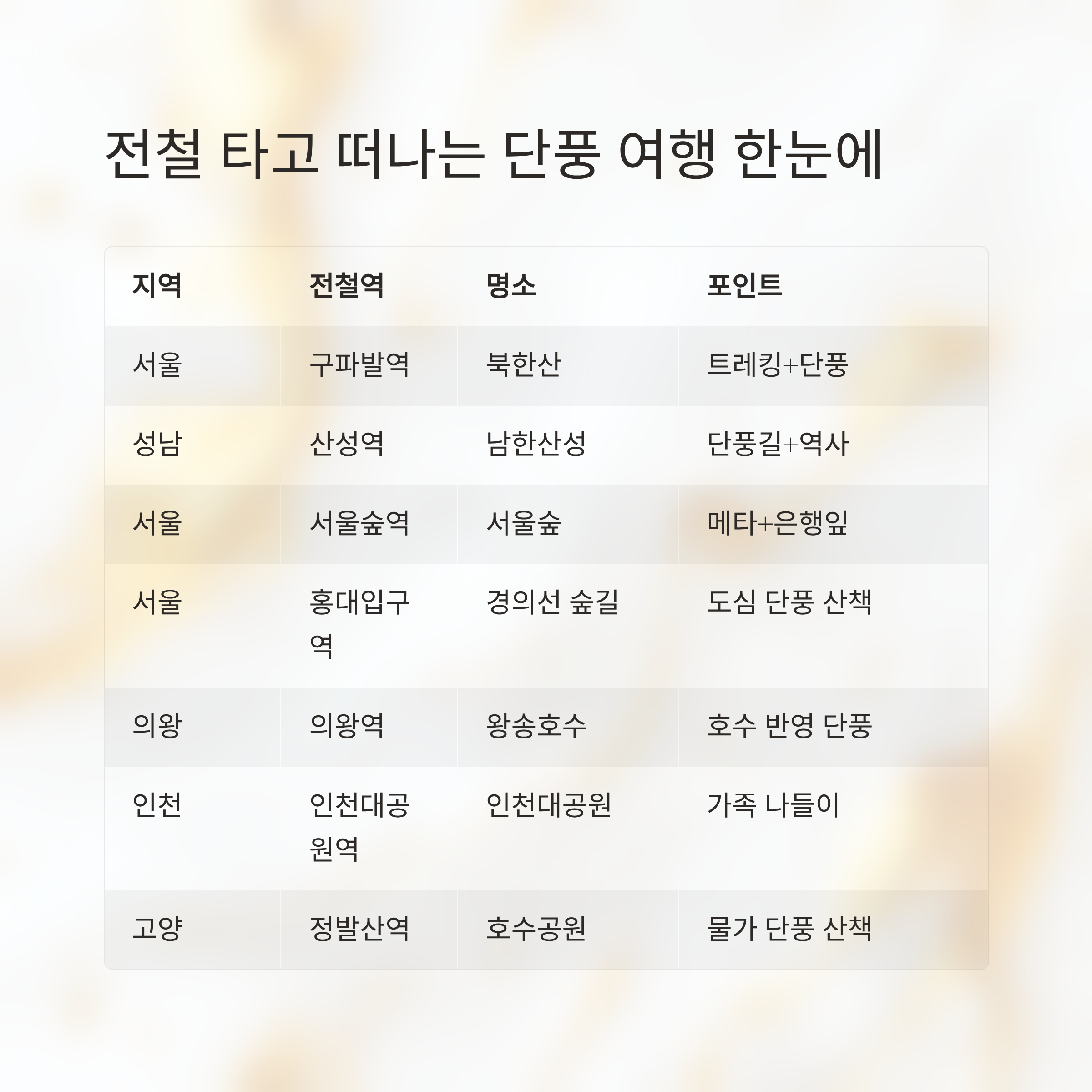 전철 타고 갈 수 있는 단풍 명소 리스트를 정리해드릴게요.
