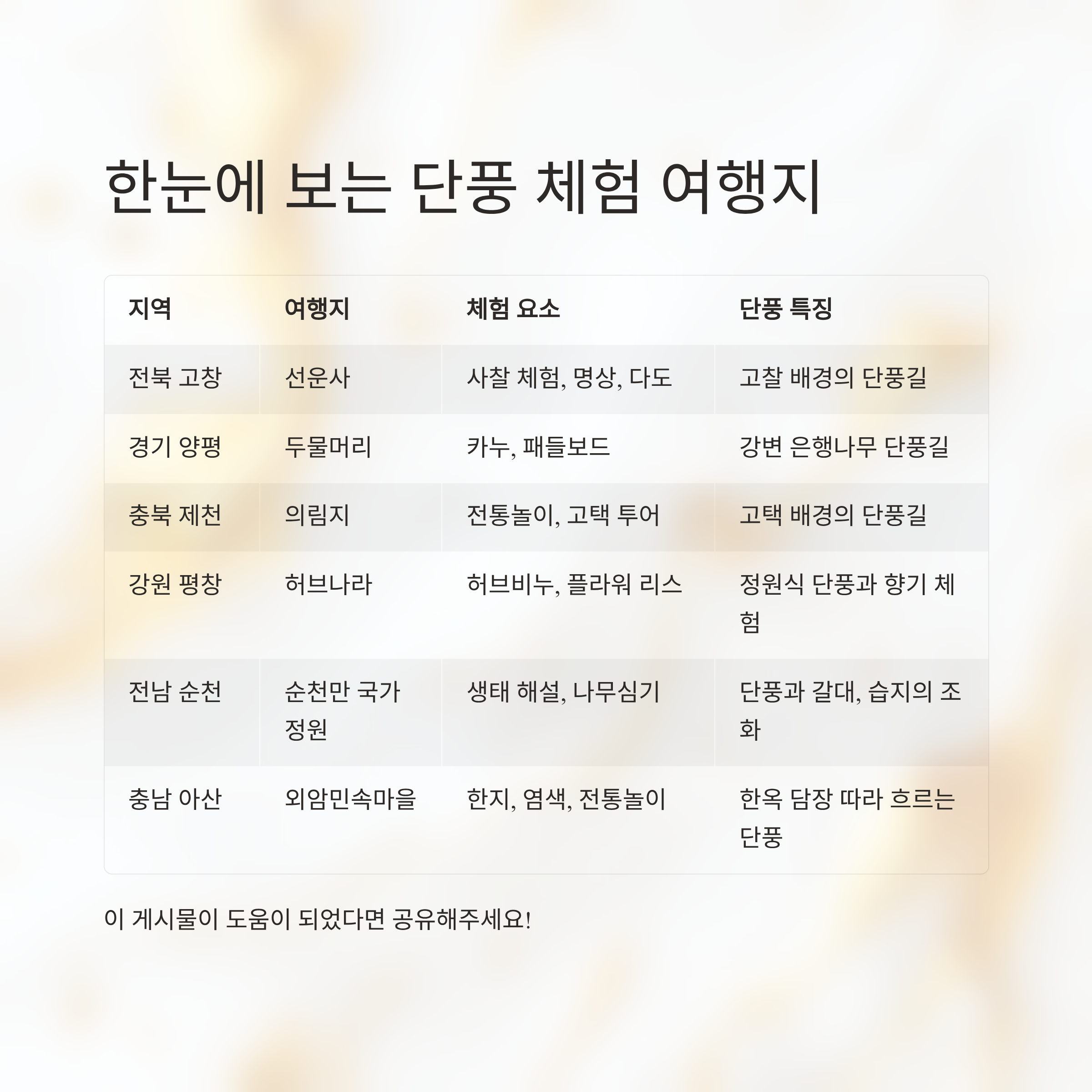 지역 여행지 이름 체험 요소 단풍 특징