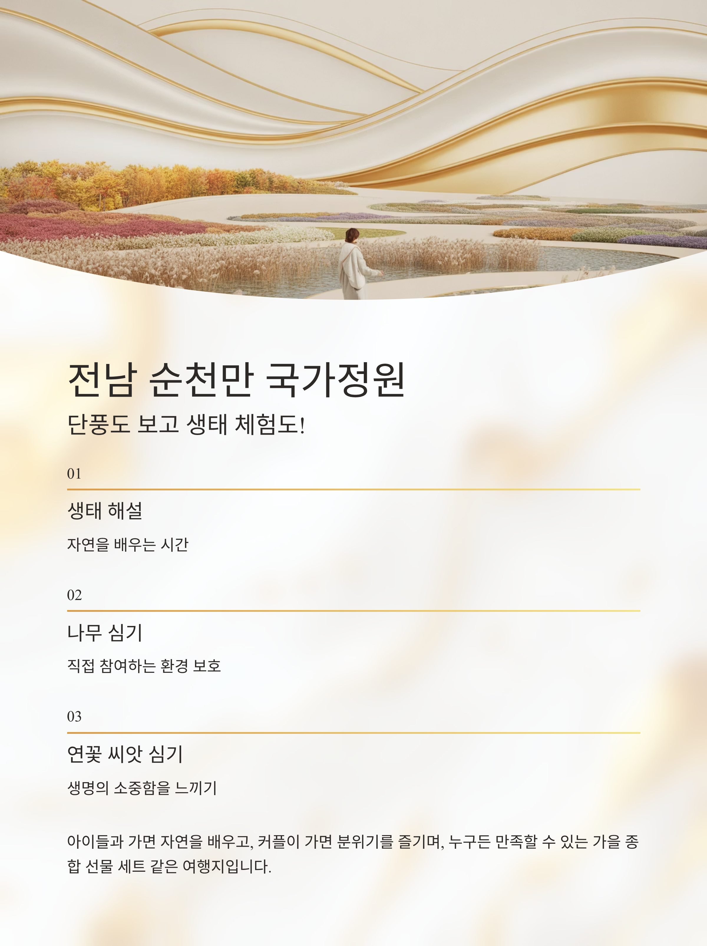 | 전남 순천 | 순천만 국가정원 | 생태 해설, 나무심기 등 자연 체험 | 단풍과 갈대, 습지의 환상 조화 |
