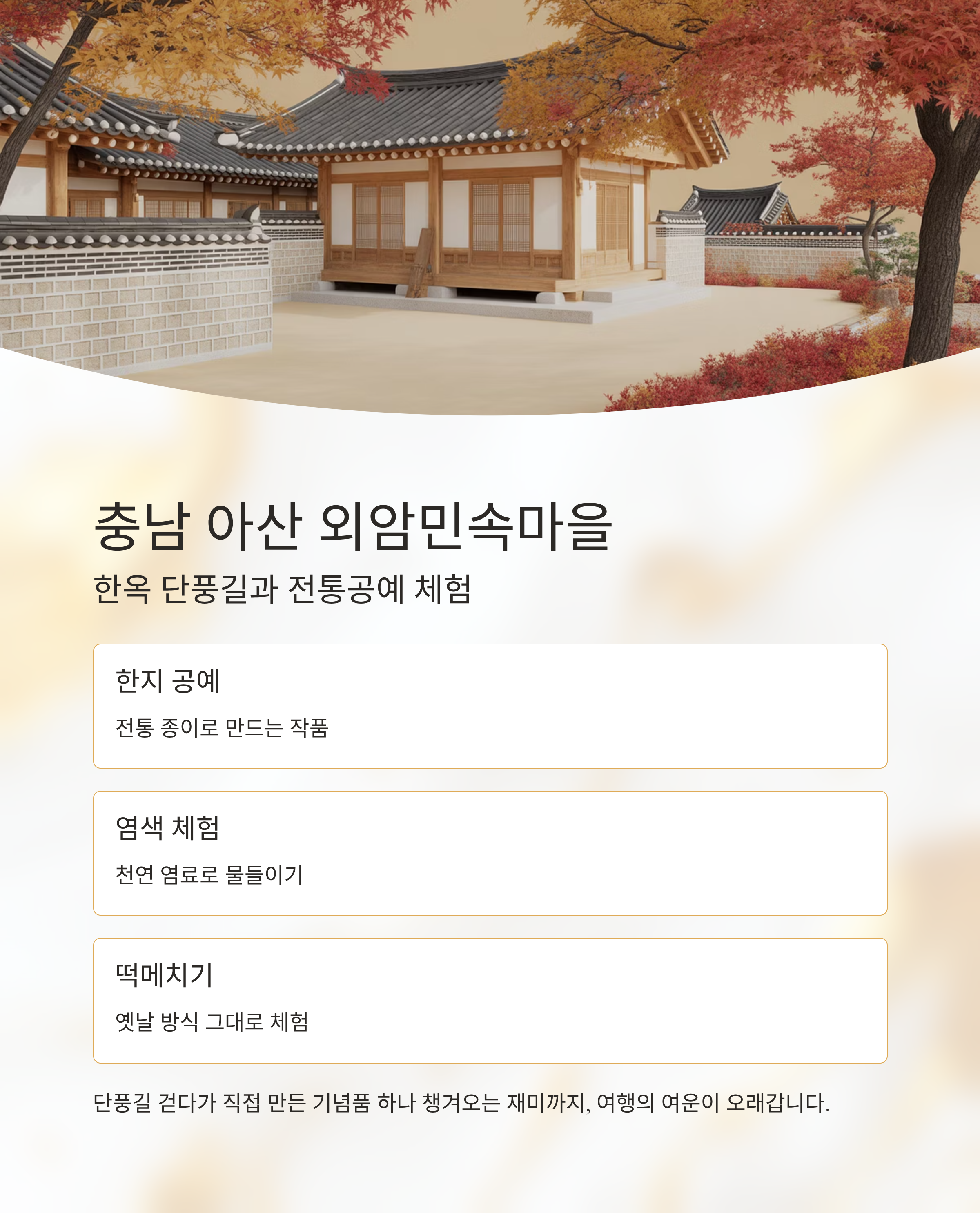 | 충남 아산 | 외암민속마을 | 한지, 염색, 전통놀이 | 한옥 담장을 타고 흐르는 단풍길 |