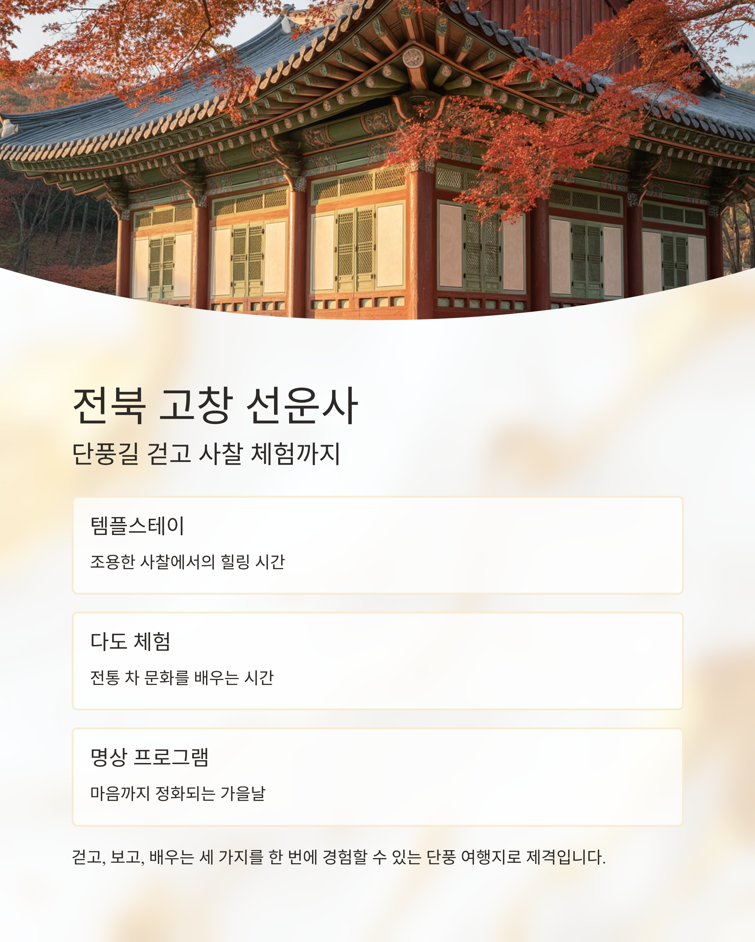 | 전북 고창 | 선운사 | 사찰 체험, 명상, 다도 | 고찰 배경의 단풍길 |