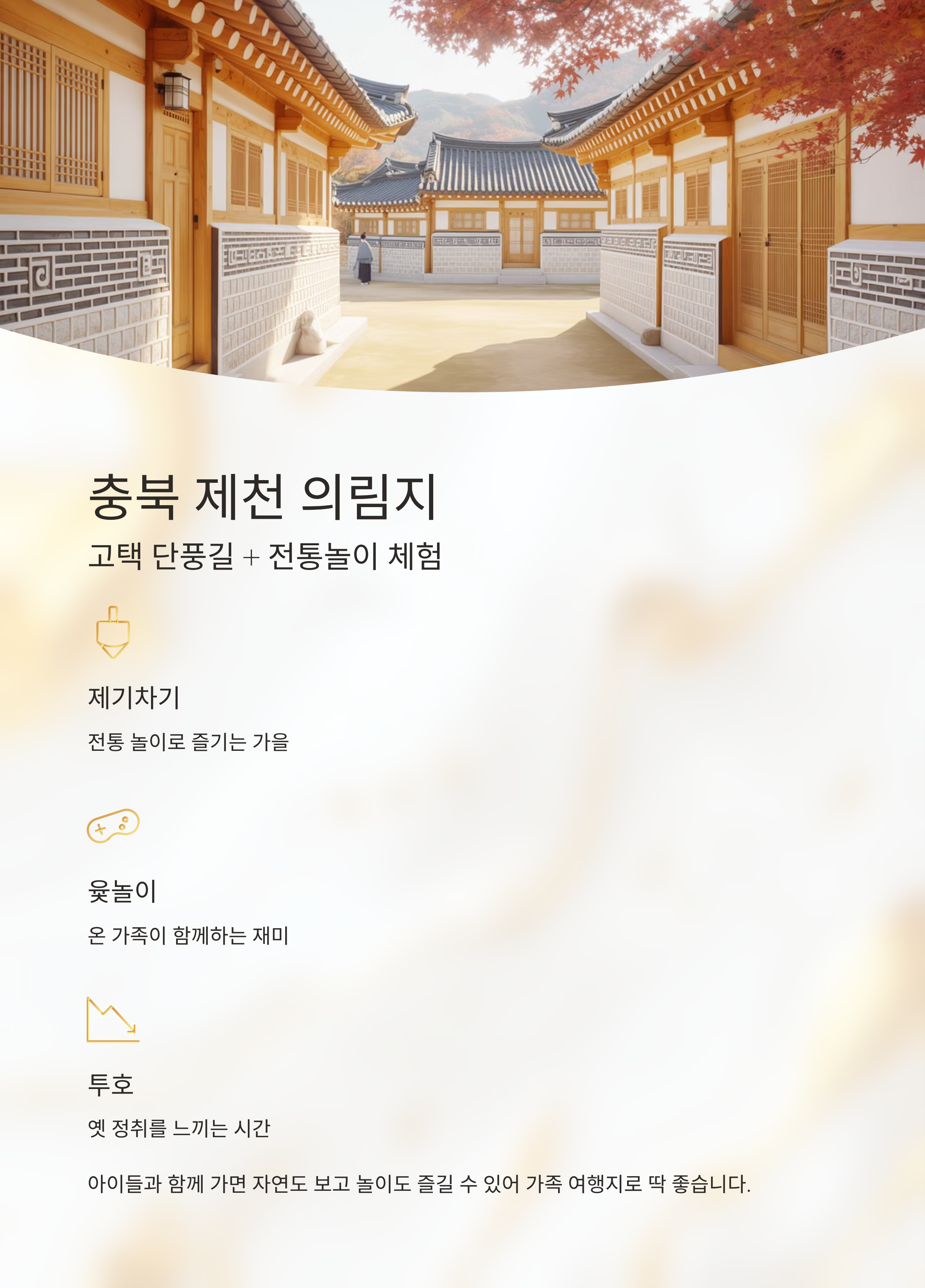 단풍만 보기 아쉬울 때, 전통의 숨결이 깃든 곳에서 가을을 맞이해보세요가을 단풍의 화려함도 좋지만, 전통문화와 어우러졌을 때 그 분위기는 훨씬 더 깊어집니다. 붉게 물든 나뭇잎 사이로 보