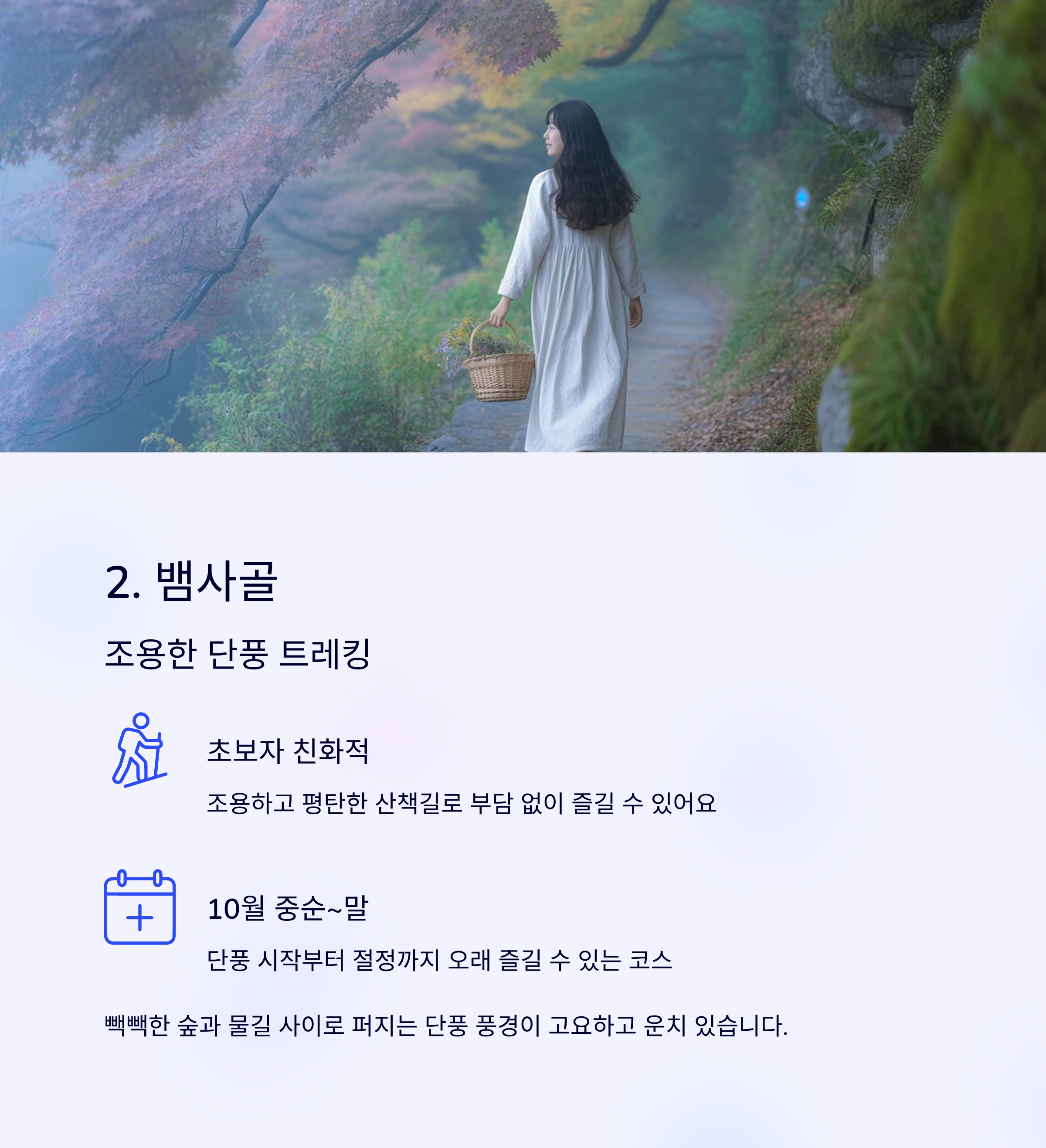 | 뱀사골 | 10월 말 | 쉬움 | 평탄한 트레킹 코스 |