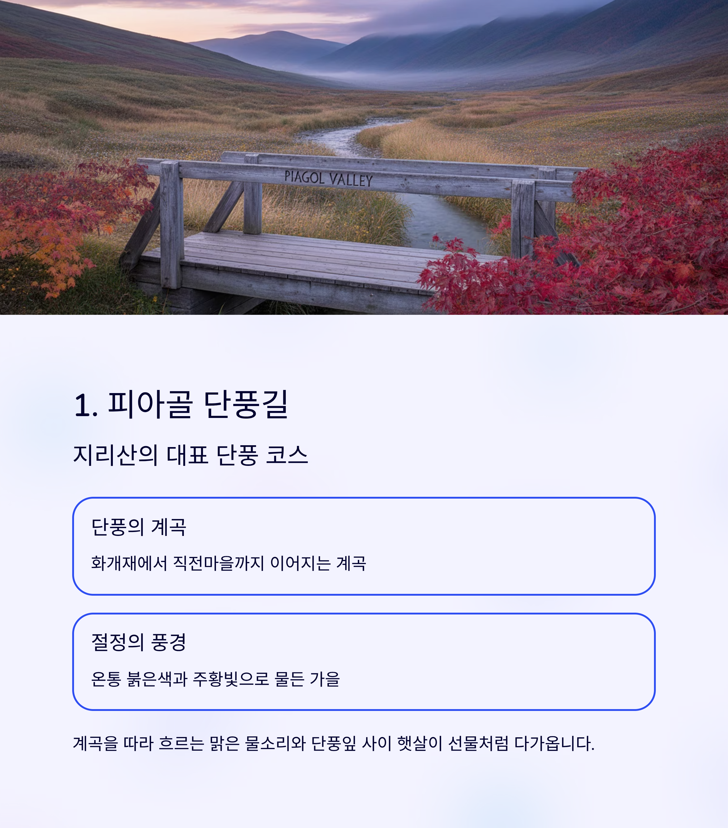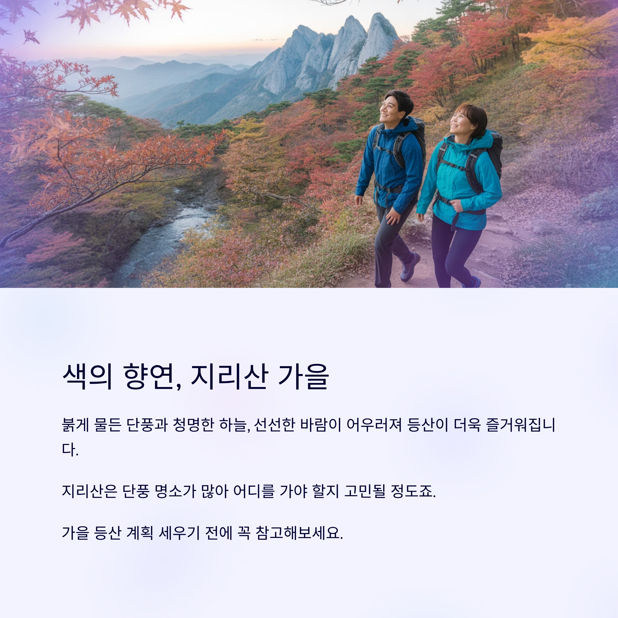 가을이 오면 지리산은 그야말로 색의 향연입니다. 붉게 물든 단풍과 청명한 하늘, 선선한 바람이 어우러져 등산이 더욱 즐거워지죠. 특히 지리산은 단풍 명소로 손꼽히는 곳이 많아 어디를 가야 할지 고민될 정도입니다. 이 글에서는 지리산에서 꼭 가봐야 할 단풍 명소 TOP5를 소개해드릴게요. 가을 등산 계획 세우기 전에 꼭 참고해보세요.