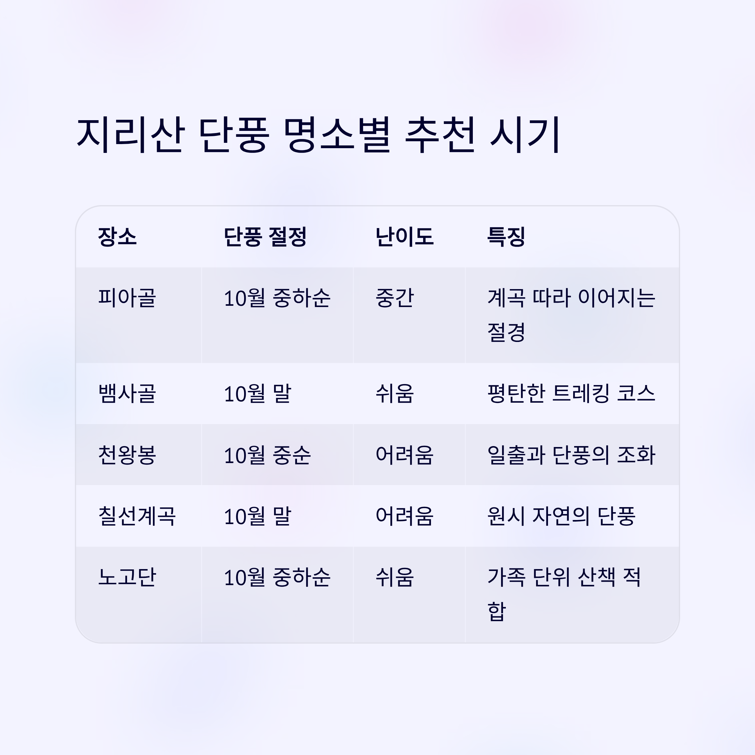 | 천왕봉 | 10월 중순 | 어려움 | 일출과 단풍의 조화 |