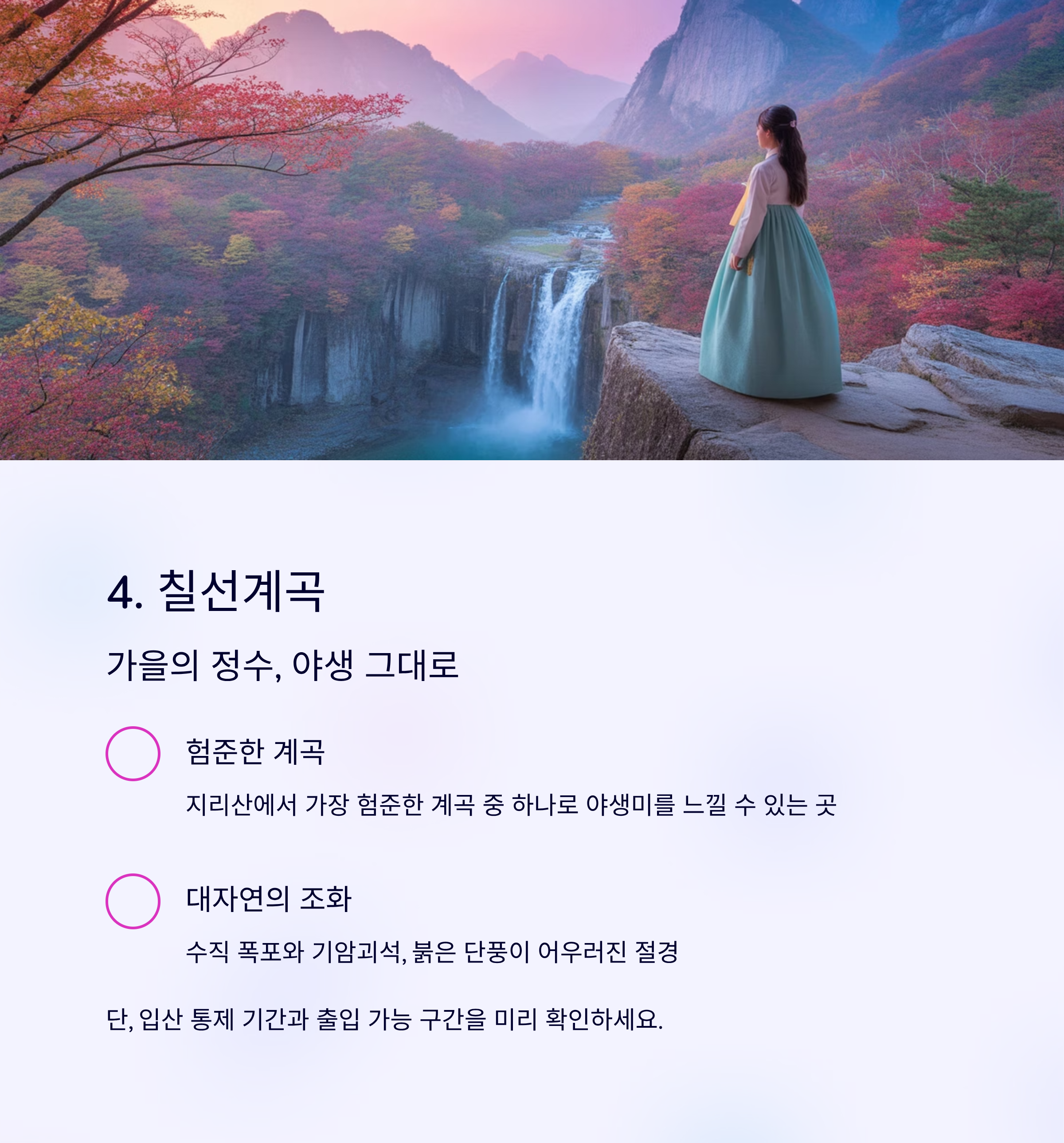 | 칠선계곡 | 10월 말 | 어려움 | 원시 자연의 단풍 |