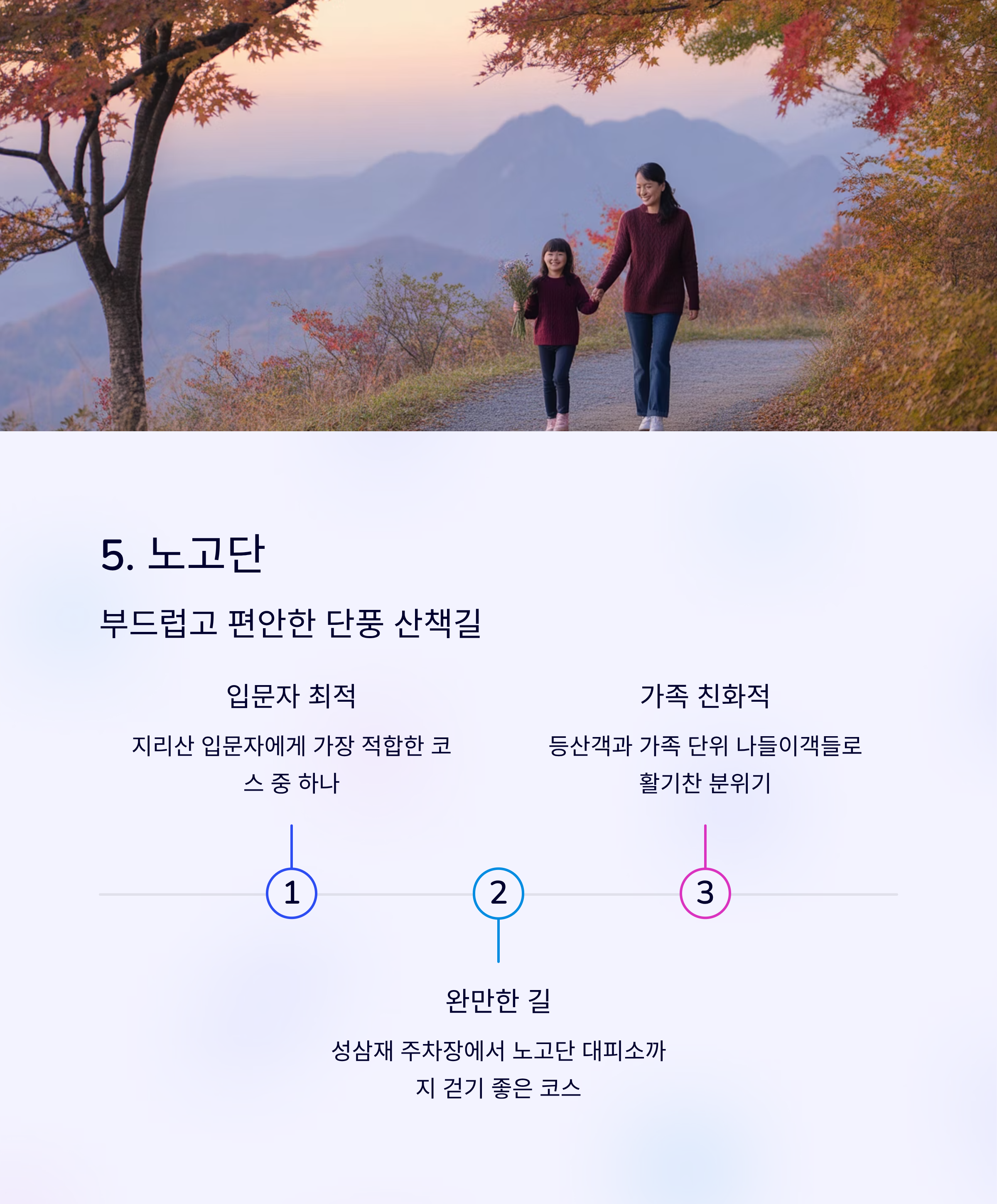 | 노고단 | 10월 중하순 | 쉬움 | 가족 단위 산책에 적합 |