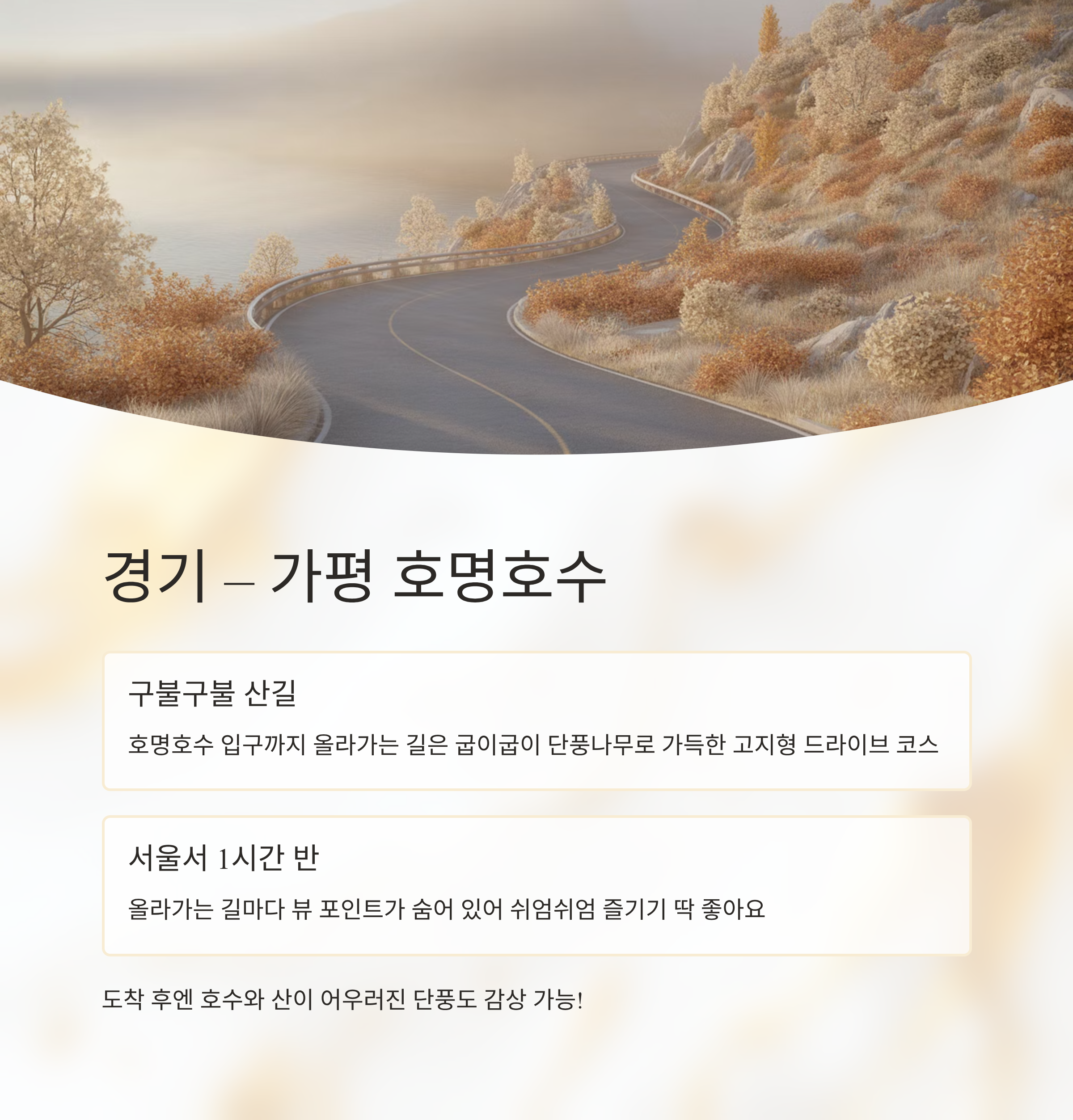 | 구불구불 산길 + 정적 | 단풍, 안개, 호수 뷰 동시 감상 |
