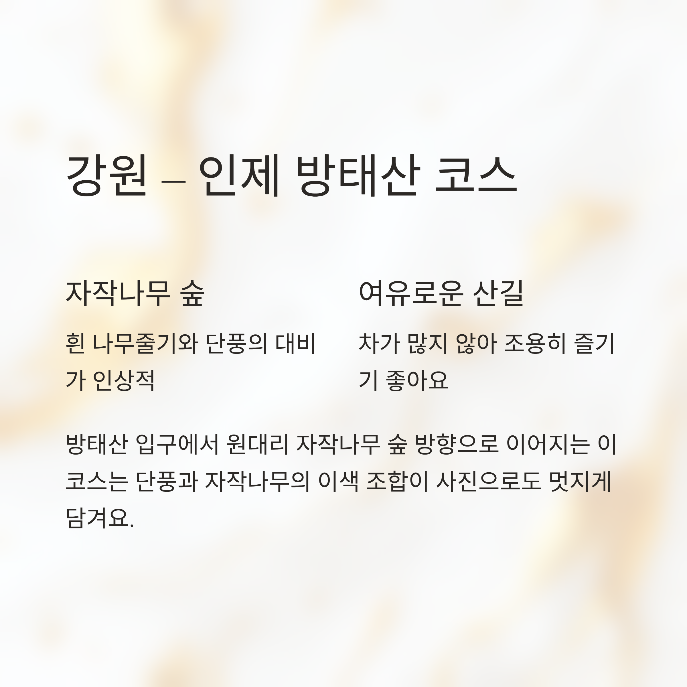 | 강원 | 인제 방태산 코스 | 자작나무+단풍의 대비 |