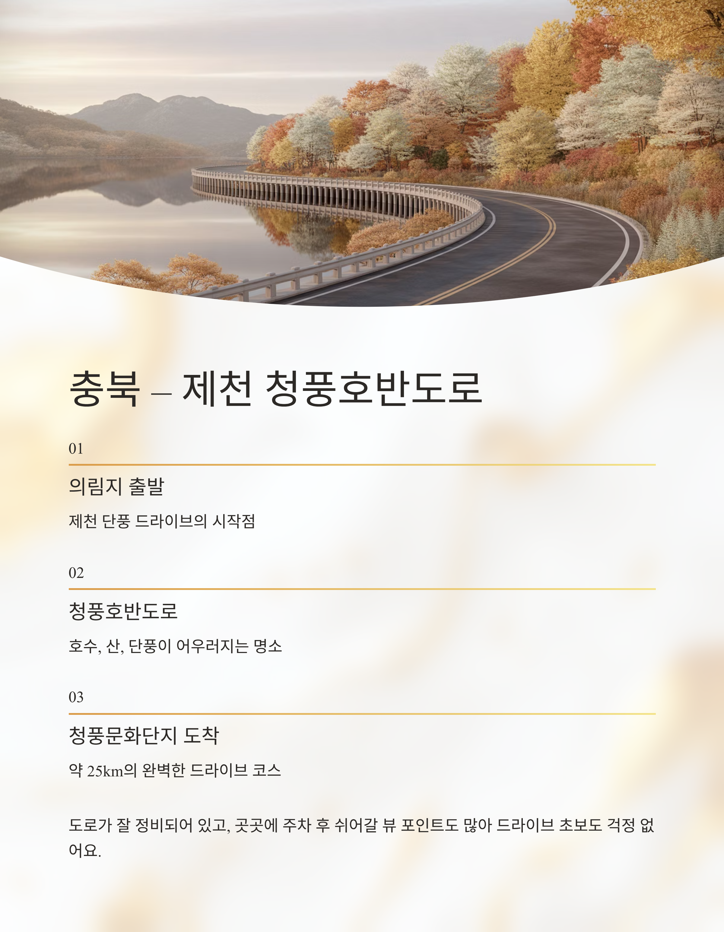 | 충북 | 제천 청풍호반도로 | 호수 뷰 단풍 드라이브 |