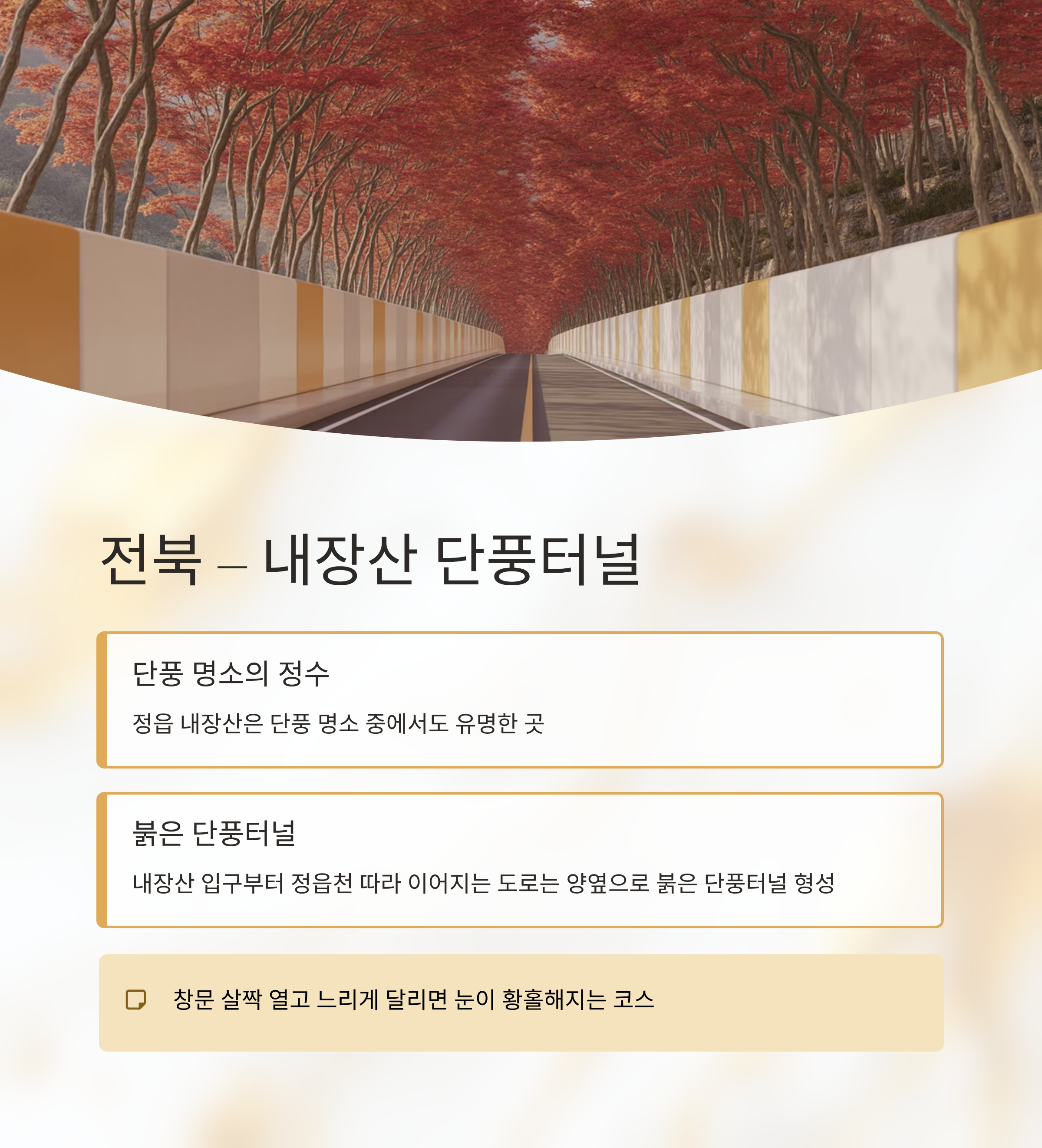 | 전북 | 내장산 단풍터널 | 붉은 터널 같은 도로 |