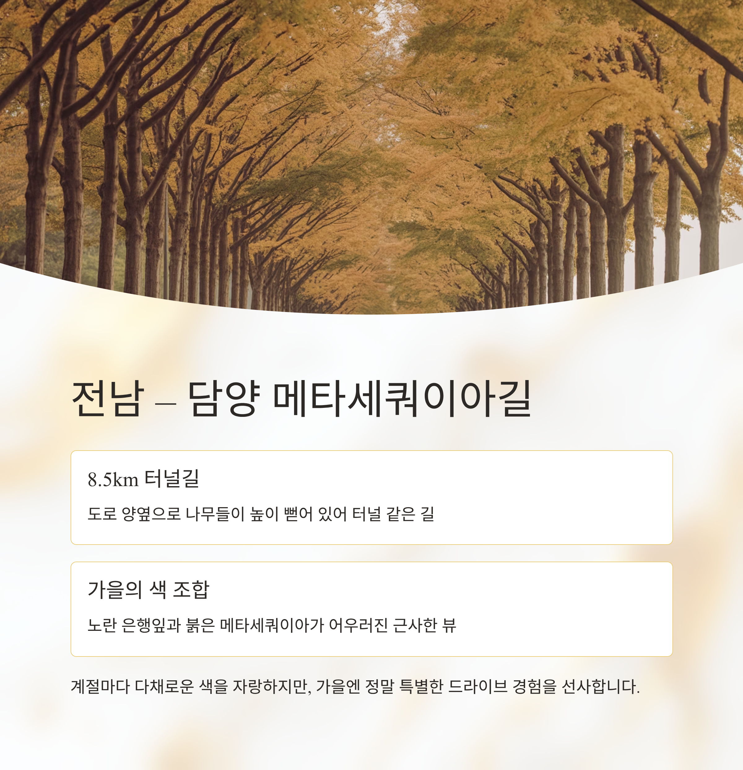 | 전남 | 담양 메타세쿼이아길 | 단풍+은행잎 터널 |