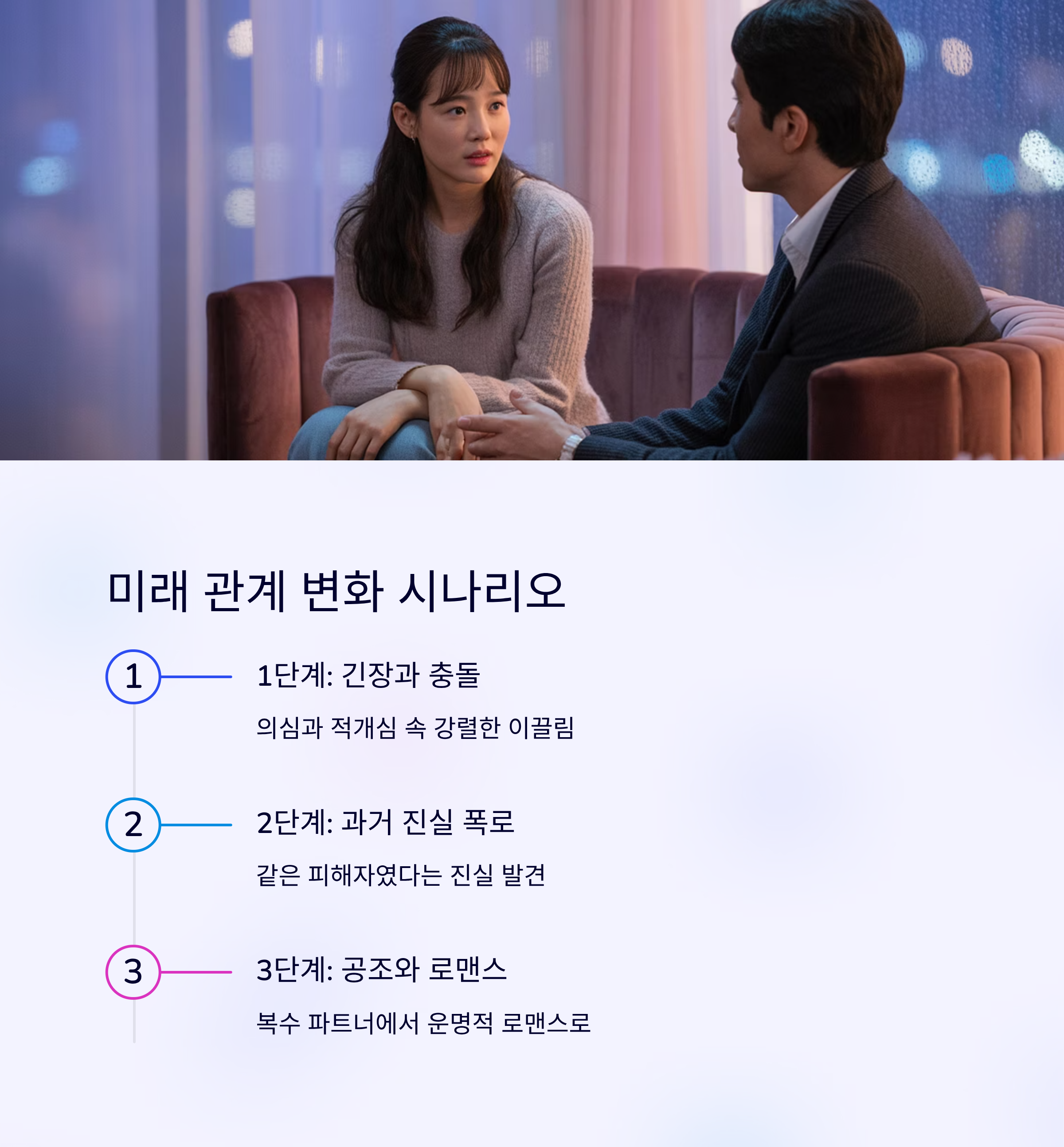 이들의 관계는 결국 **파국-화해-로맨스**의 세 단계를 거치게 될 거라고 확신해요. 특히 제가 예측하는 가장 가능성 높은 시나리오는 다음과 같습니다.