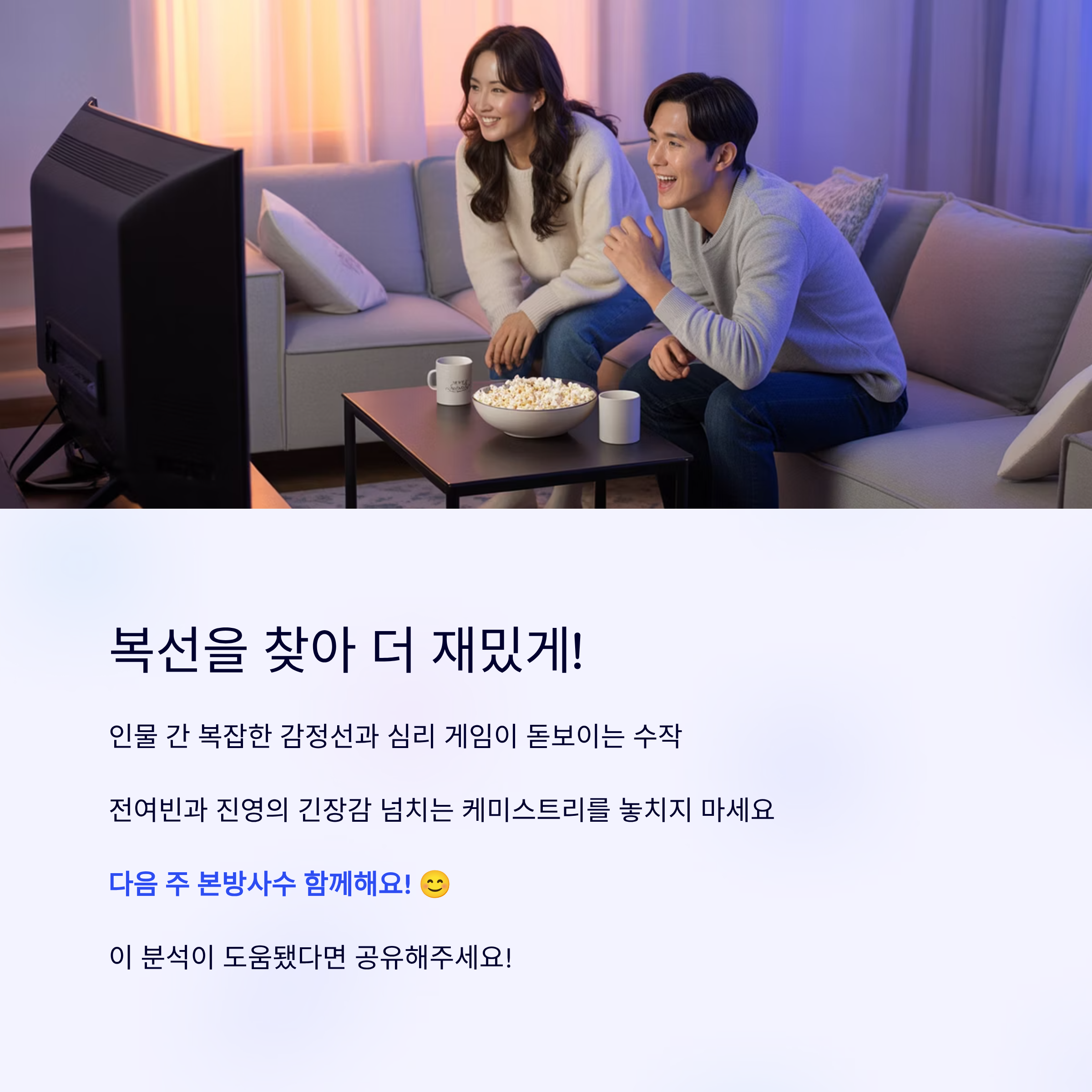 - 3단계: 공조와 로맨스 (후반부): 진실을 알게 된 두 사람은 **강력한 복수 파트너**로 거듭나며 힘을 합칩니다. 이 과정에서 서로에 대한 연민과 애정이 폭발하며, 결국 **운명적인 로맨스**를 완성할 것으로 예측됩니다.