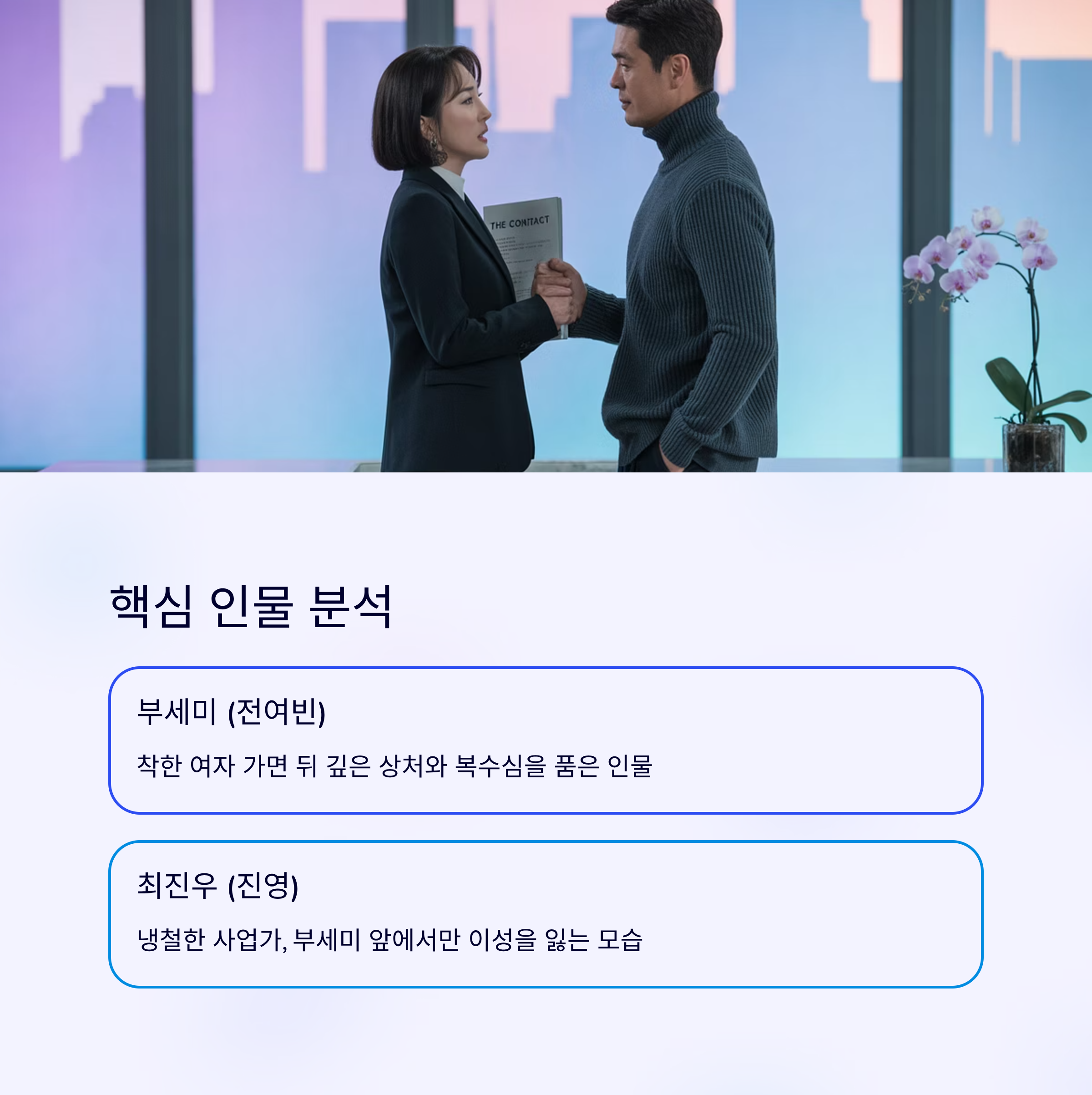 - 최진우 (진영): 냉철하고 이성적인 사업가. 하지만 부세미 앞에서는 자꾸만 이성을 잃는 모습을 보여줍니다. 그가 부세미에게 보이는 **경계심과 집착**은 과거의 어떤 사건과 깊이 연결되어 있음을 암시하죠. 어쩌면 그는 부세미가 숨기고 있는 **'비밀의 목격자'**일 수도 있어요.