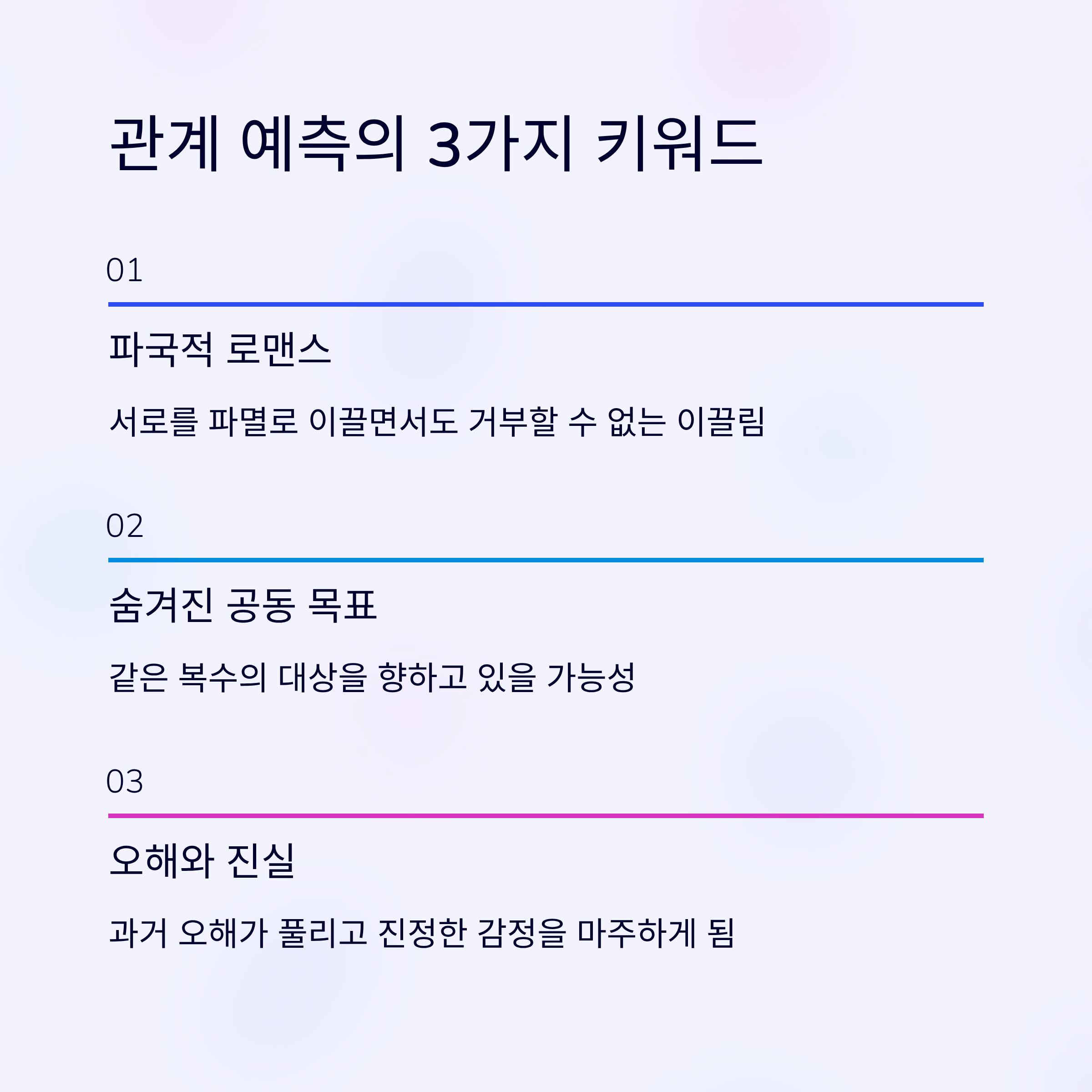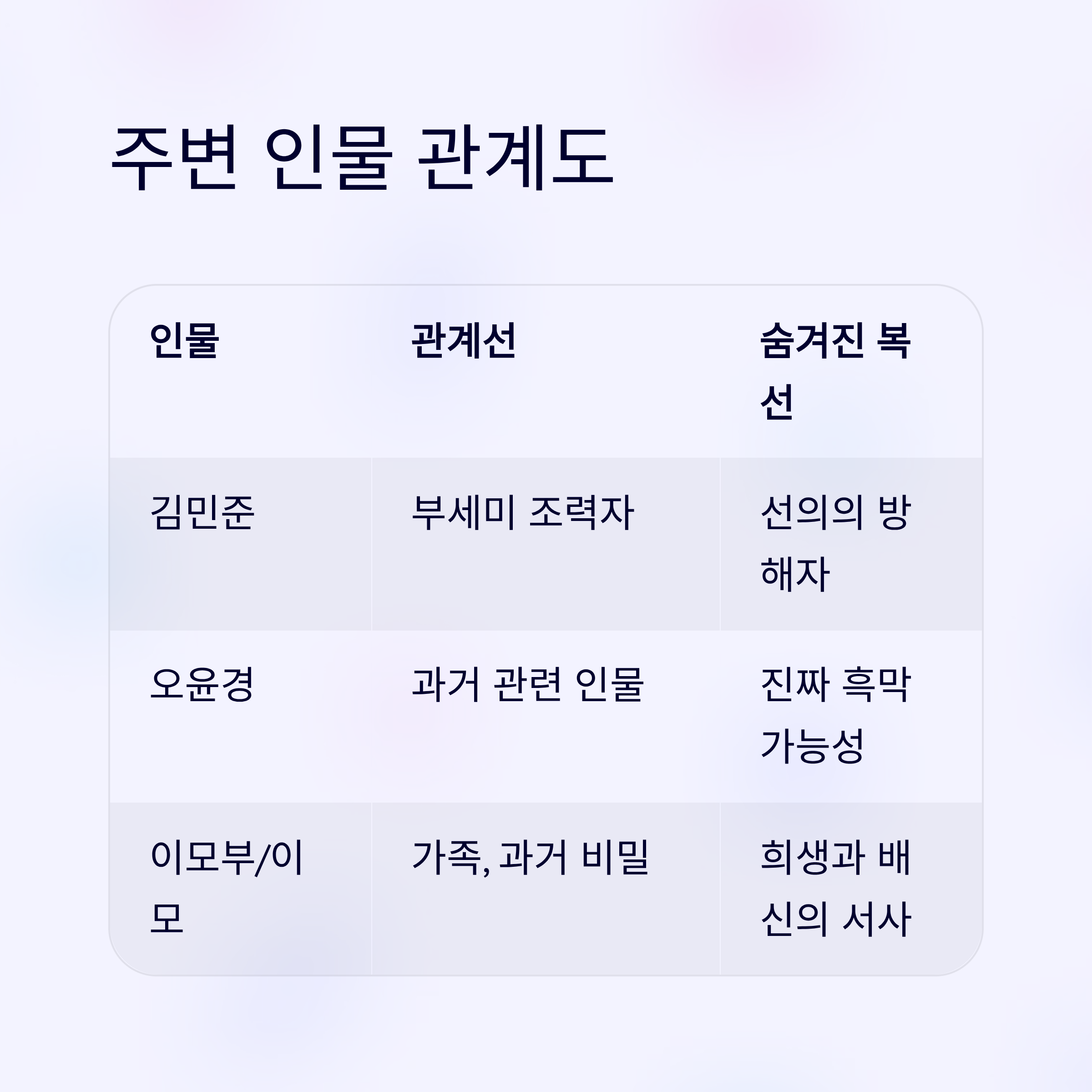 두 주인공 외에도, 주변 인물들은 이들의 관계에 복선과 갈등을 심어주는 중요한 역할을 합니다. 누가 아군이고 누가 적군인지, 표를 보면서 정리해보면 훨씬 이해하기 쉽답니다!