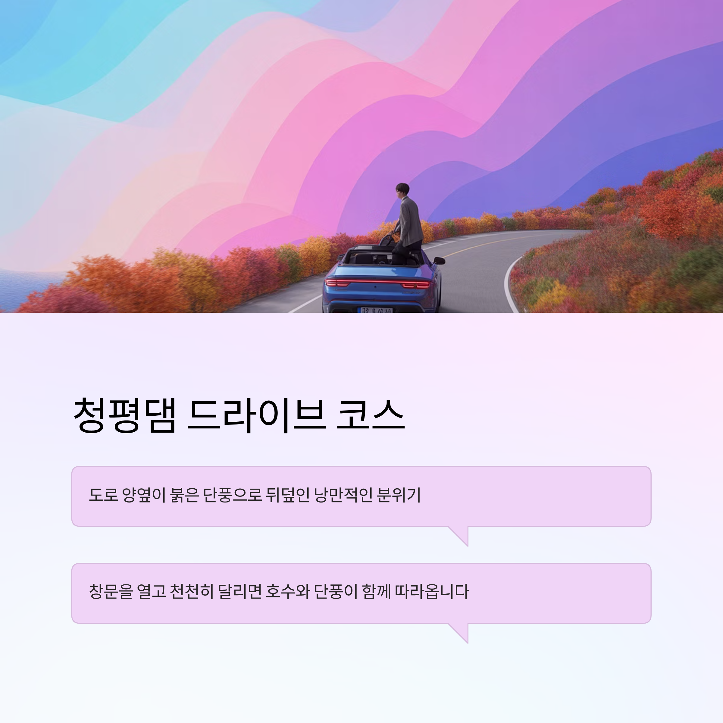 서울 근교에서 단풍과 호수를 함께 즐기고 싶다면 단연 ‘청평호’가 최고입니다. 물안개 피어나는 고요한 호수 위로 울긋불긋 단풍이 드리워진 모습은 마치 한 폭의 수채화 같죠. 이번 글에서는 청평호 단풍을 제대로 즐길 수 있는 명소와, 호수 위에서 감상할 수 있는 특별한 방법들을 정리해드립니다. 가까운 가을 나들이로도, 로맨틱한 드라이브 코스로도 딱이에요.