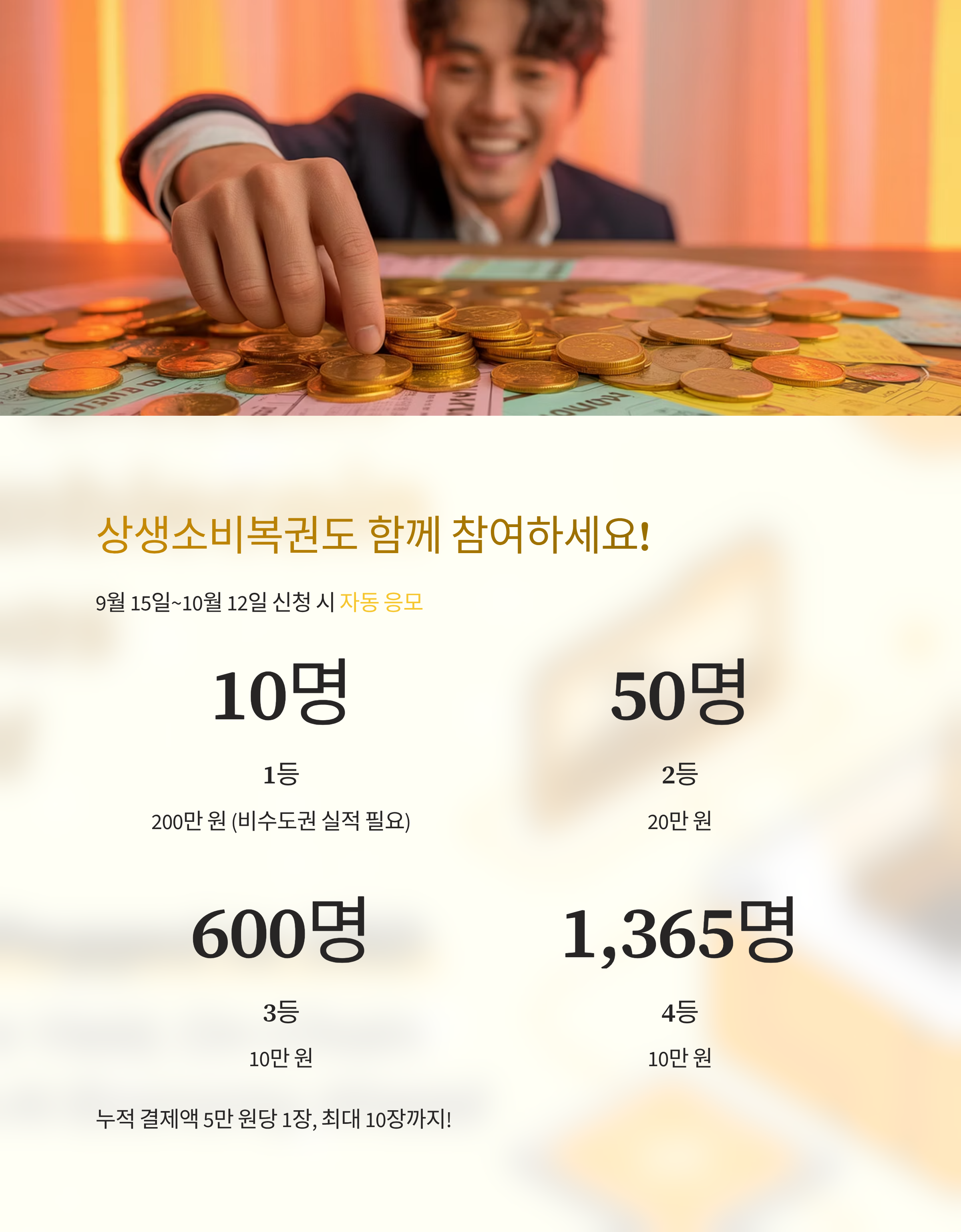 9월 15일부터 10월 12일까지 상생페이백을 신청하면 자동으로 상생소비복권에도 응모됩니다.