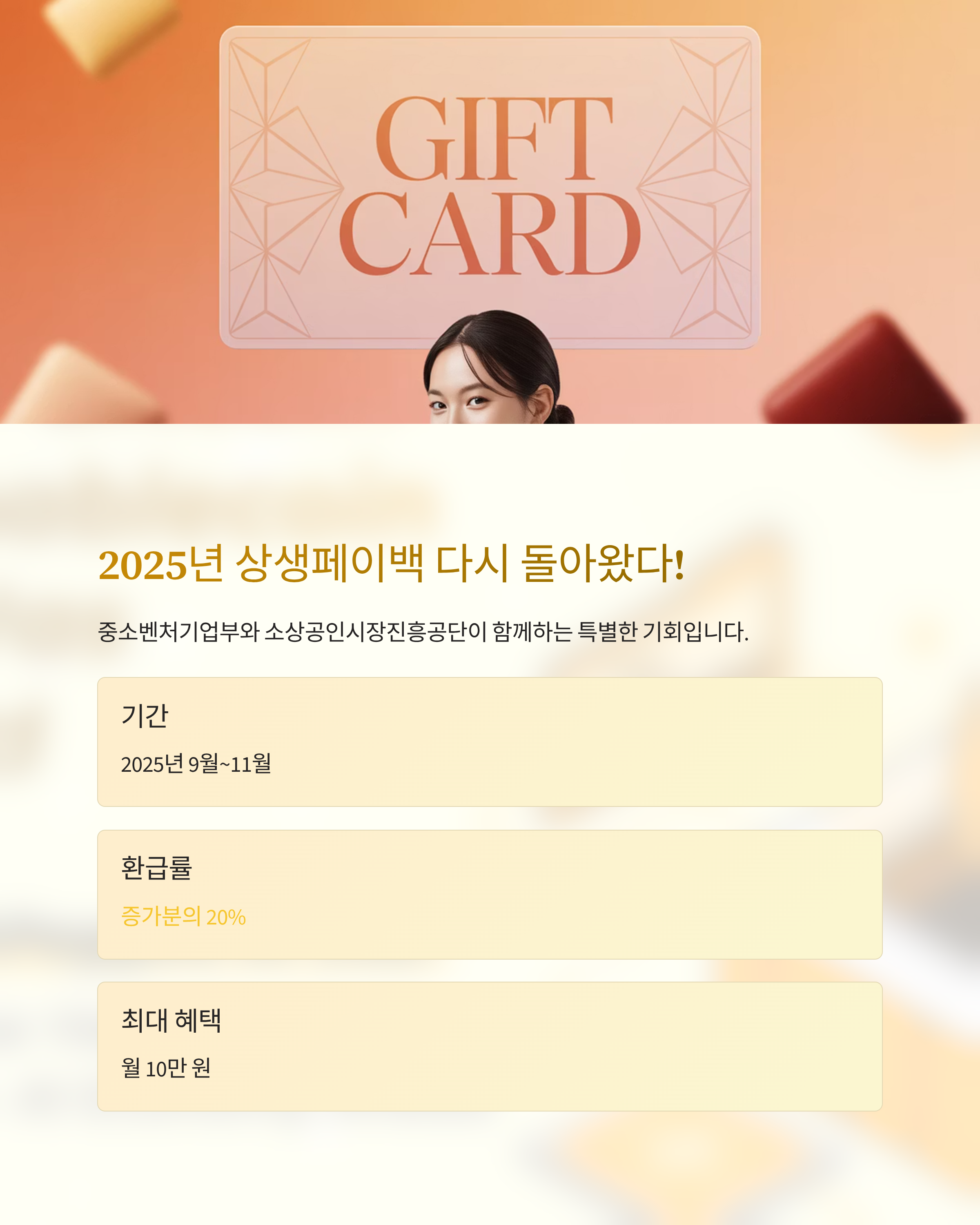 2025년 가을, 중소벤처기업부와 소상공인시장진흥공단이 함께하는 ‘상생페이백’이 다시 돌아왔습니다. 2024년 월평균 카드 사용액보다 2025년 9월부터 11월까지의 월별 소비가 증가하면, 그 증가분의 20%를 디지털 온누리상품권으로 돌려받을 수 있는 기회인데요. 최대 월 10만 원, 총 30만 원까지 환급받을 수 있는 이 이벤트, 어떻게 참여하면 되는지 지금부터 자세히 알려드릴게요.