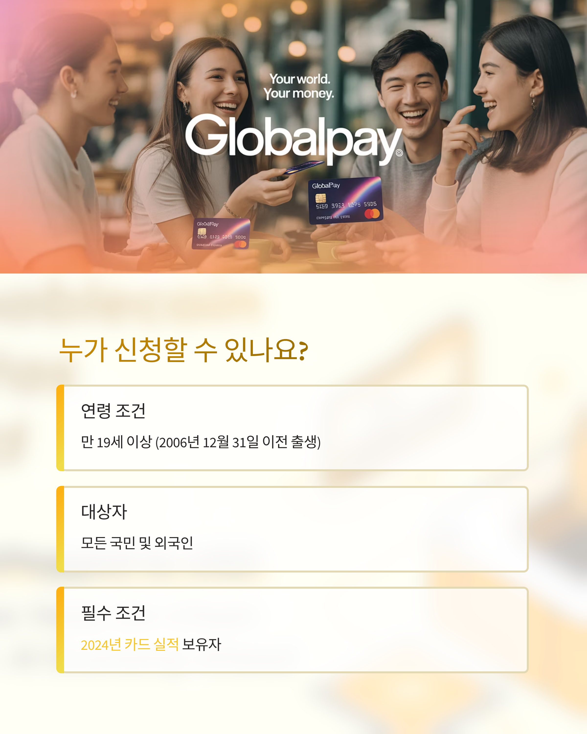 신청 대상은 2024년에 카드 실적이 있었던 만 19세 이상 모든 국민 및 외국인입니다. 즉, 2006년 12월 31일 이전 출생자라면 누구든 신청이 가능해요.