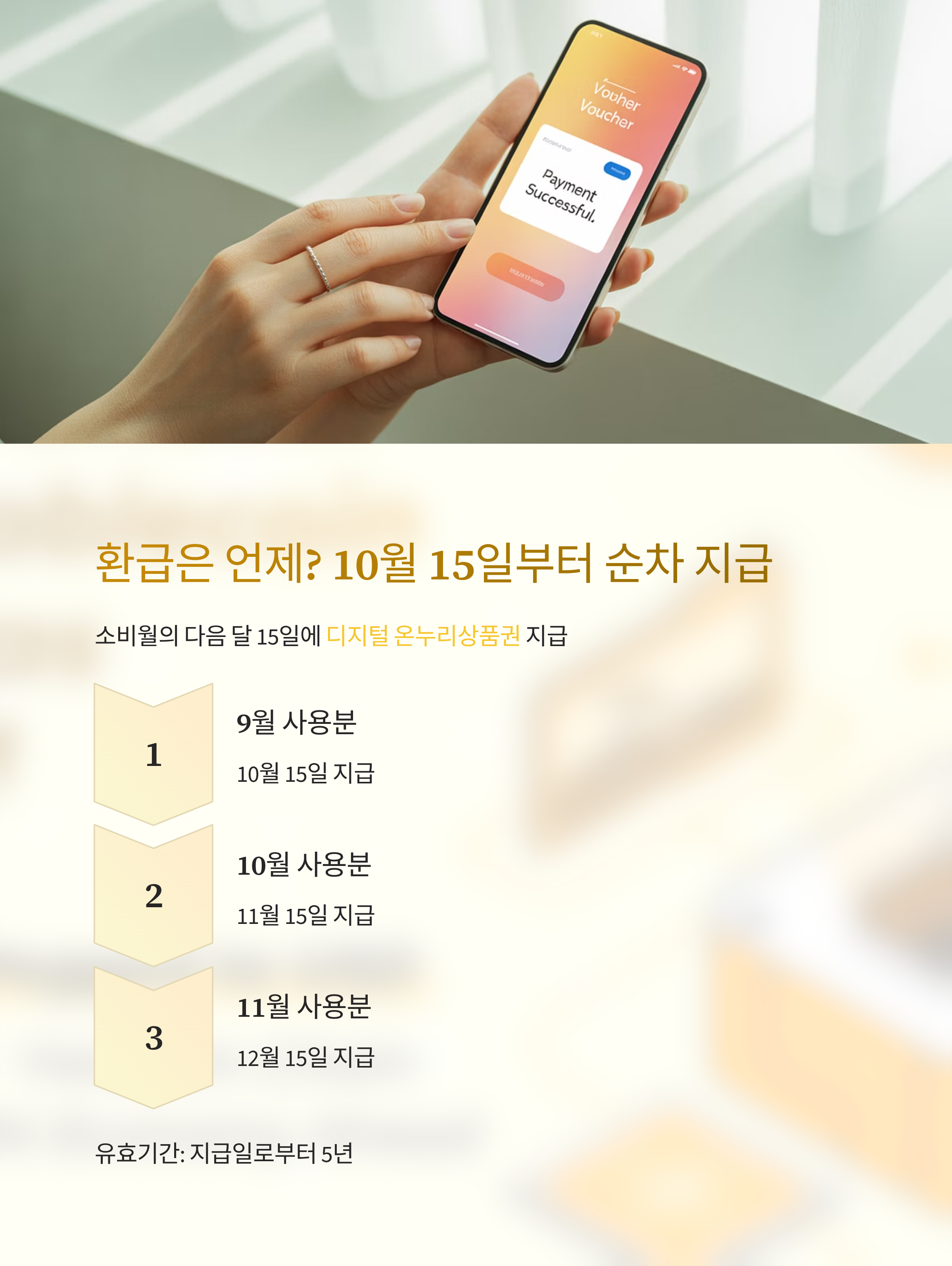 소비월의 다음 달 15일에 디지털 온누리상품권으로 지급됩니다.