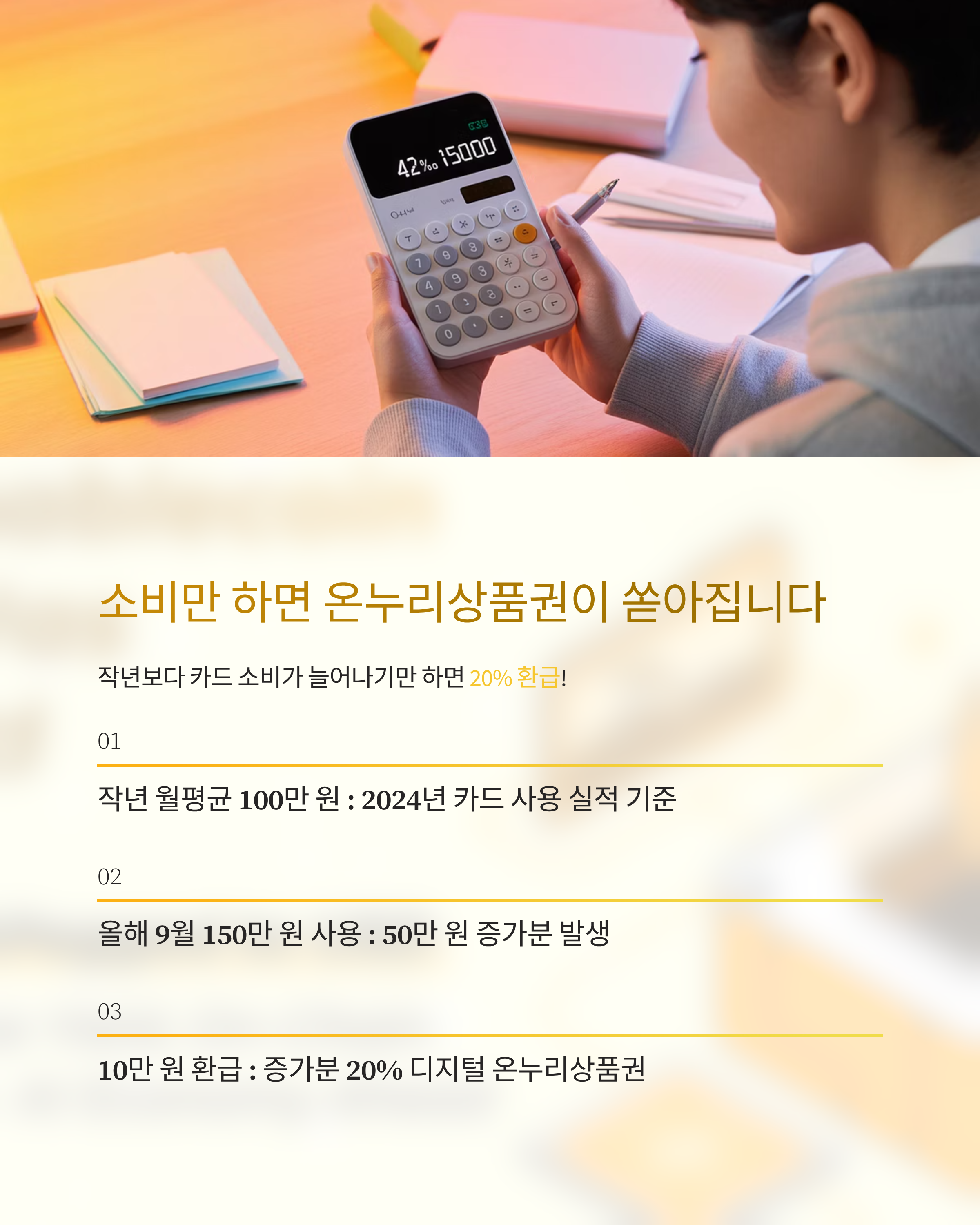 2025년 9월부터 11월까지의 카드 소비가 작년보다 늘어나기만 하면 됩니다. 늘어난 소비금액의 20%를 디지털 온누리상품권으로 환급받을 수 있는데요.