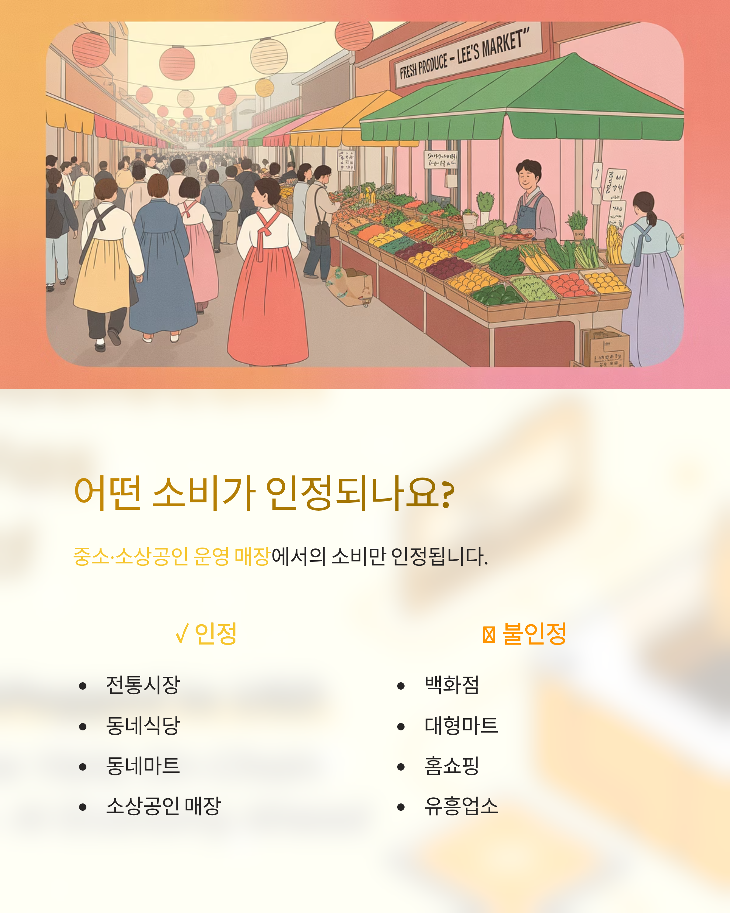 소비 실적으로 인정되는 곳은 중소·소상공인이 운영하는 매장입니다. 예를 들면 전통시장, 동네마트, 일반 식당 등 대부분의 생활밀착형 소비처가 포함돼요.