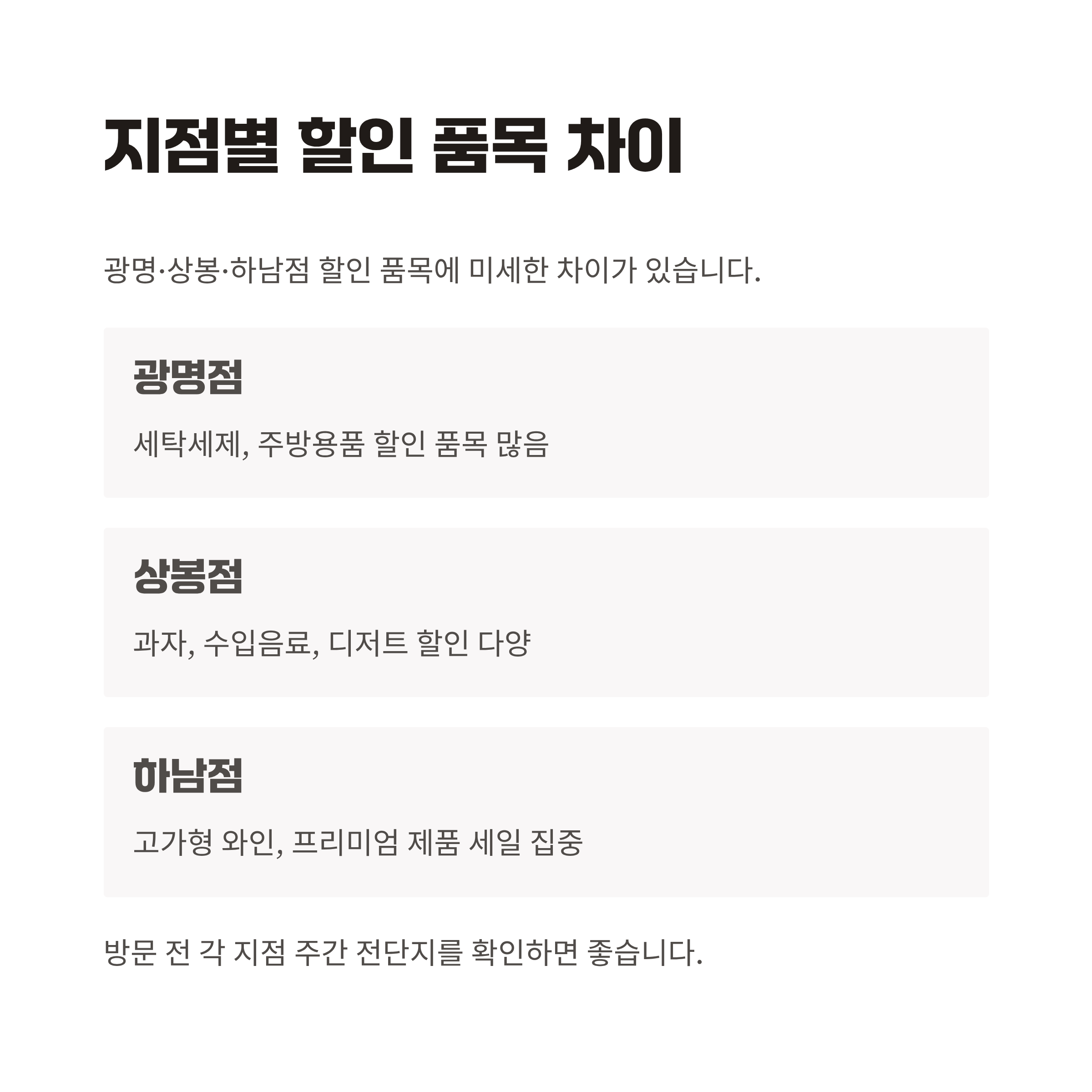 | 광명점 | 세탁세제, 주방용품 할인 품목 많음 |