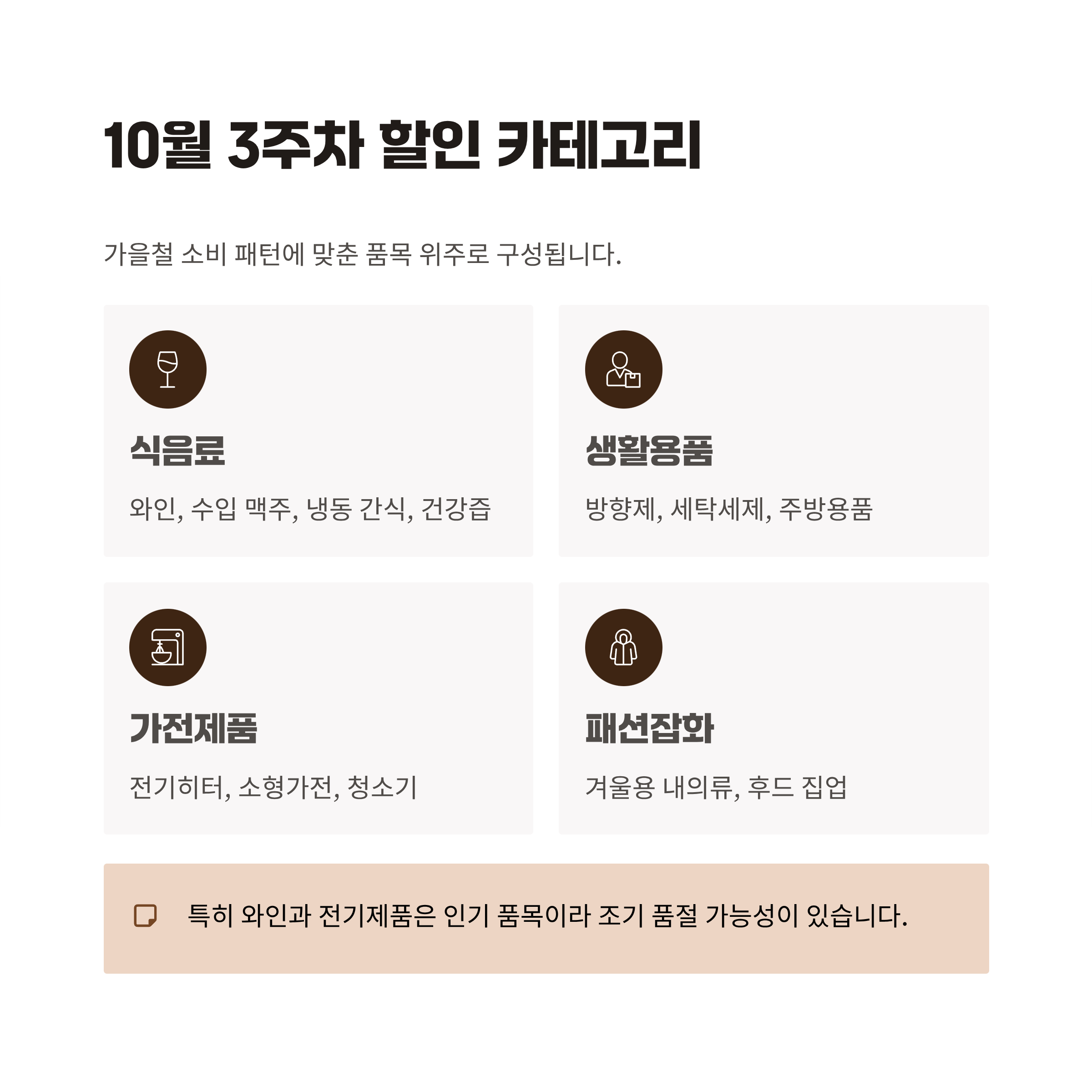 이번 주는 가을철 소비 패턴에 맞춘 품목 위주로 구성이 돋보입니다.
