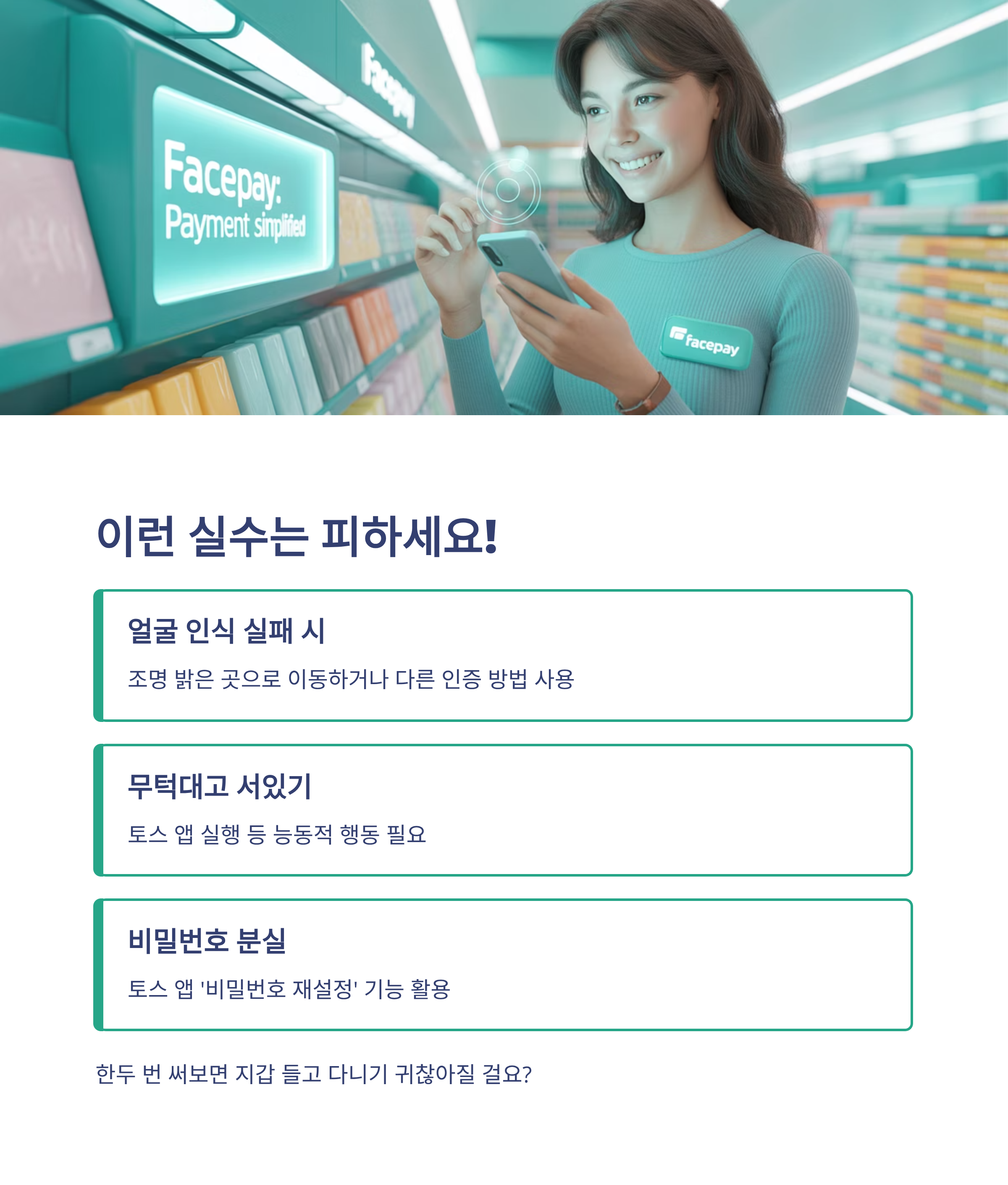 - 간혹 점원이 "토스 페이요?"라고 물어봤는데, 그냥 멍하니 서서 얼굴만 들이미는 경우가 있어요. 음... 이건 좀 곤란하겠죠? '토스' 앱을 실행하거나, 결제 기기에 얼굴을 인식시키는 등의 능동적인 행동이 필요합니다.