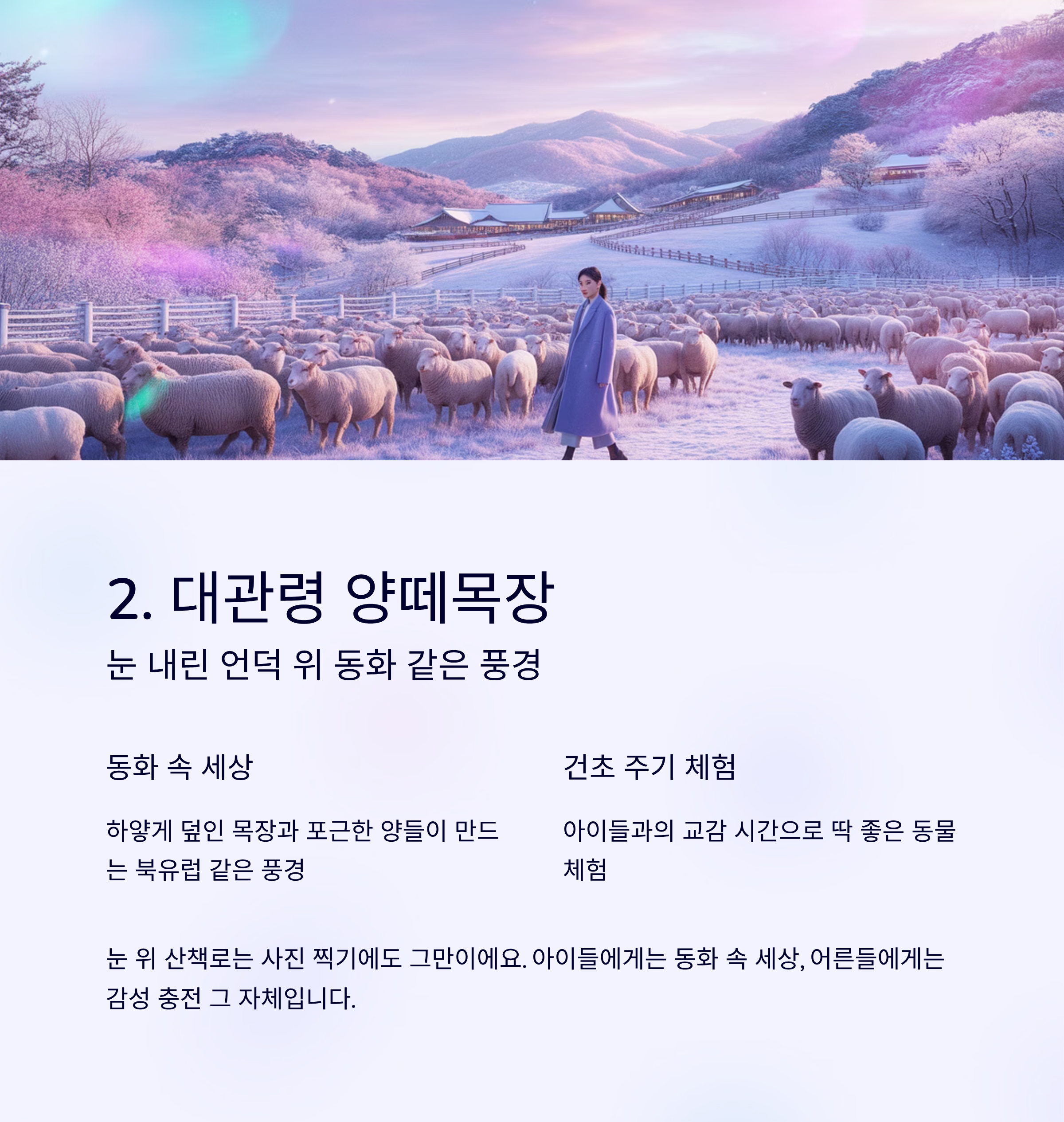 | 2 | 대관령 양떼목장 | 눈 속 동물체험, 포토존 |