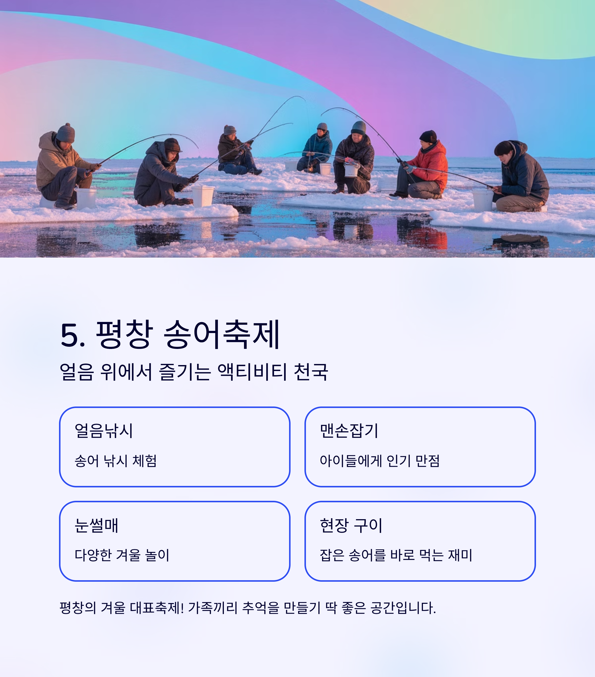 | 5 | 평창 송어축제 | 얼음낚시+놀이 체험+먹거리 |