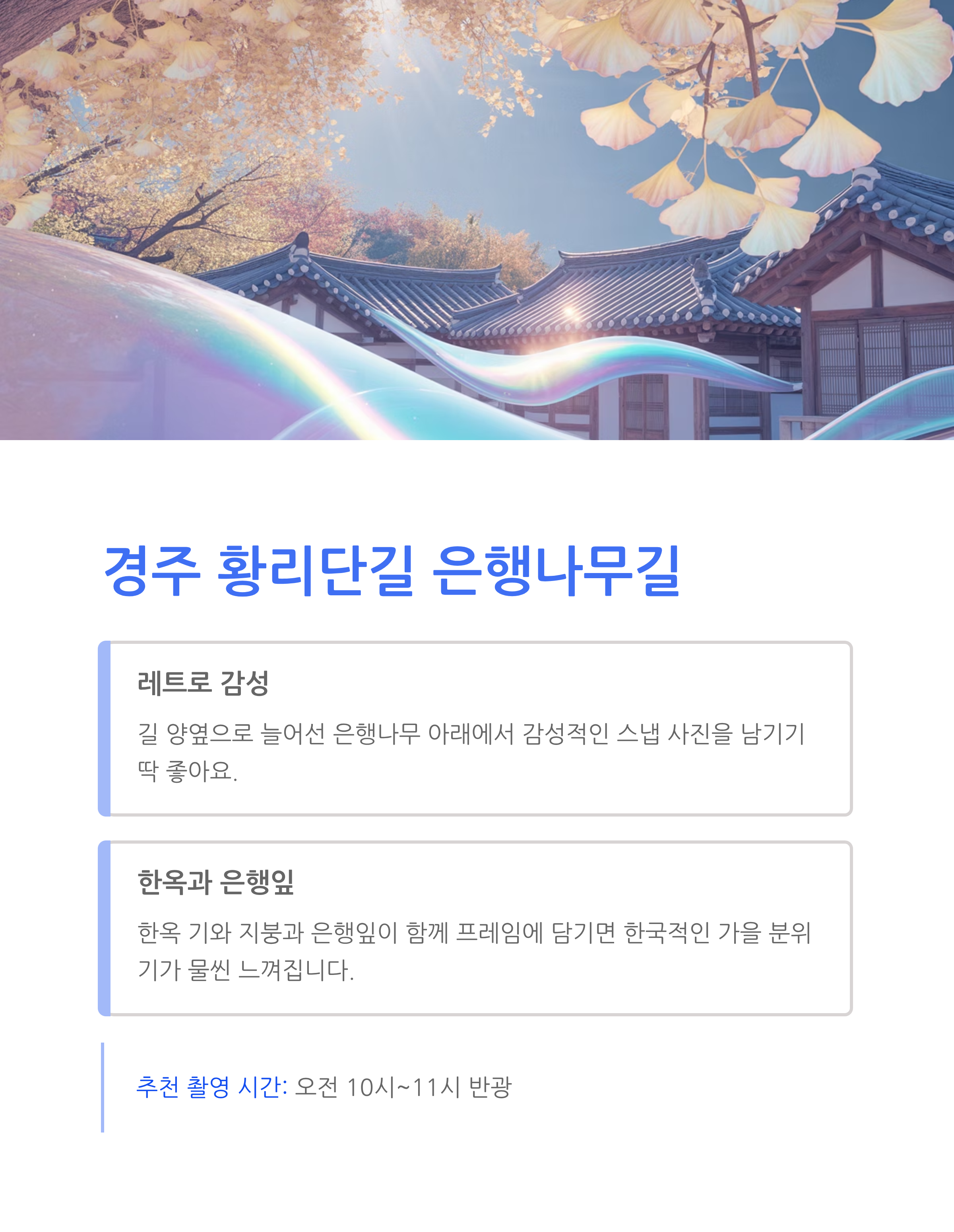 | 경주 황리단길 | 한옥+은행잎 | 오전 10시~11시 반광 |