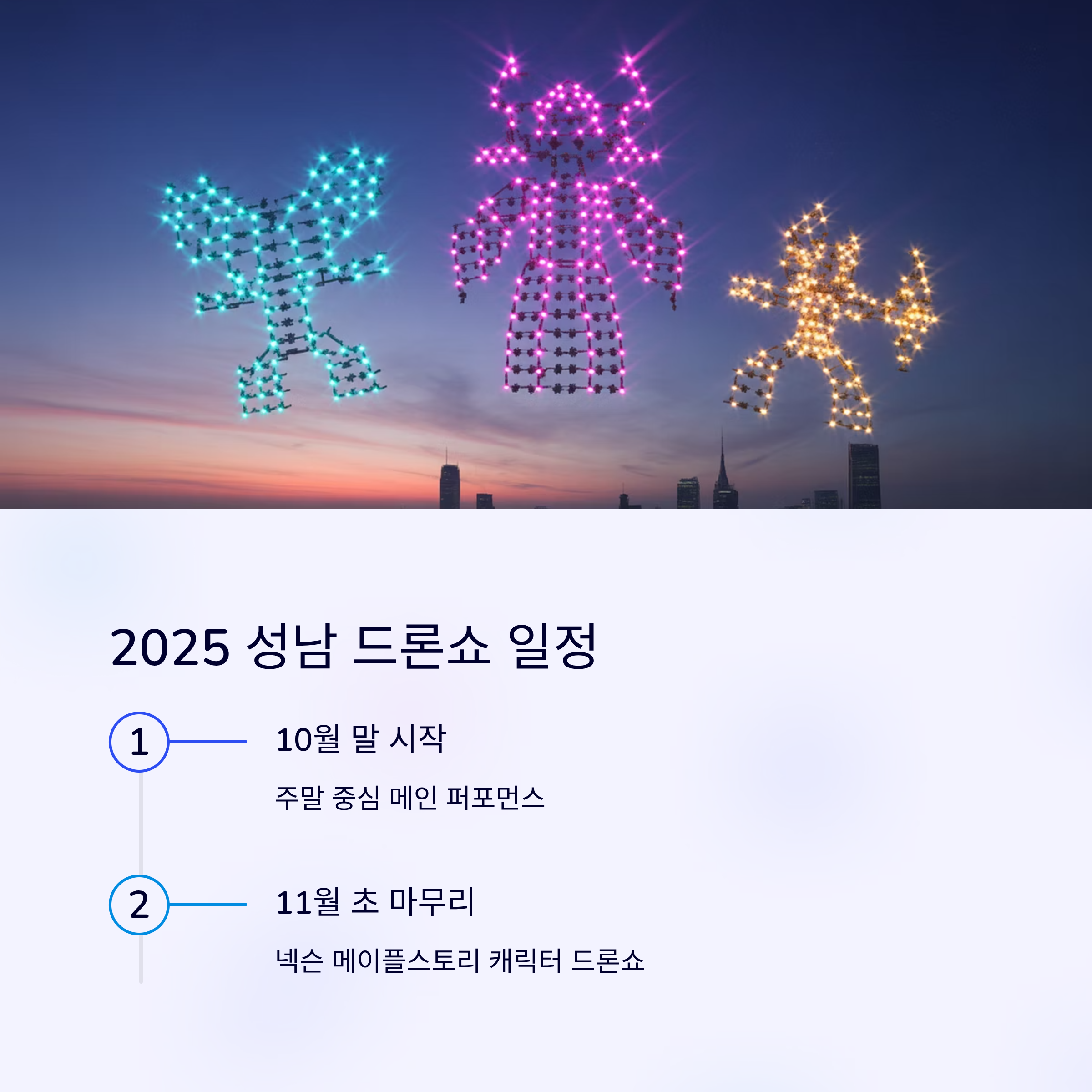2025 성남 드론쇼는 10월 말부터 11월 초까지 열릴 예정이며, 주말 중심으로 메인 퍼포먼스가 펼쳐집니다.