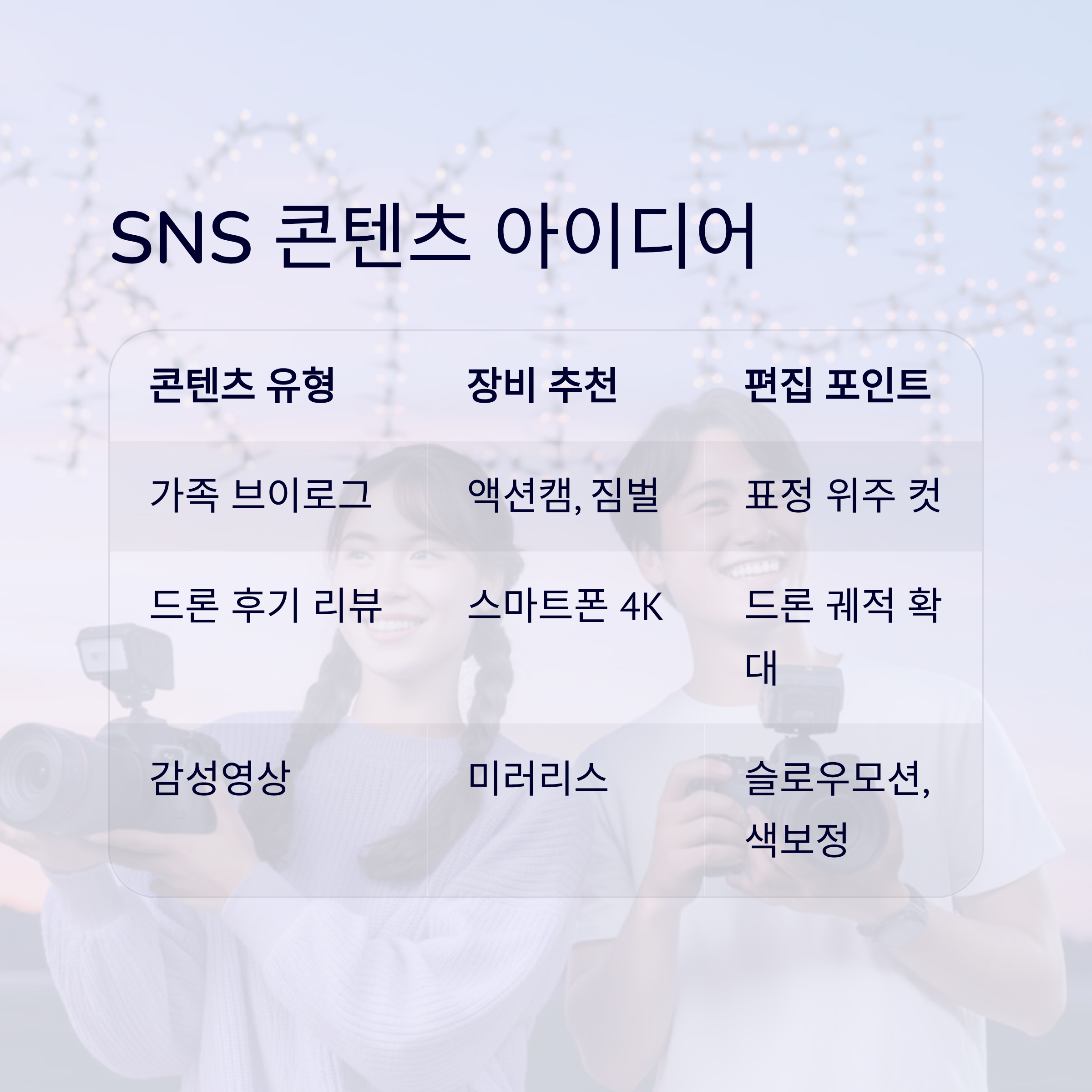 | 가족 브이로그 | 액션캠, 짐벌 | 표정 위주 컷 |