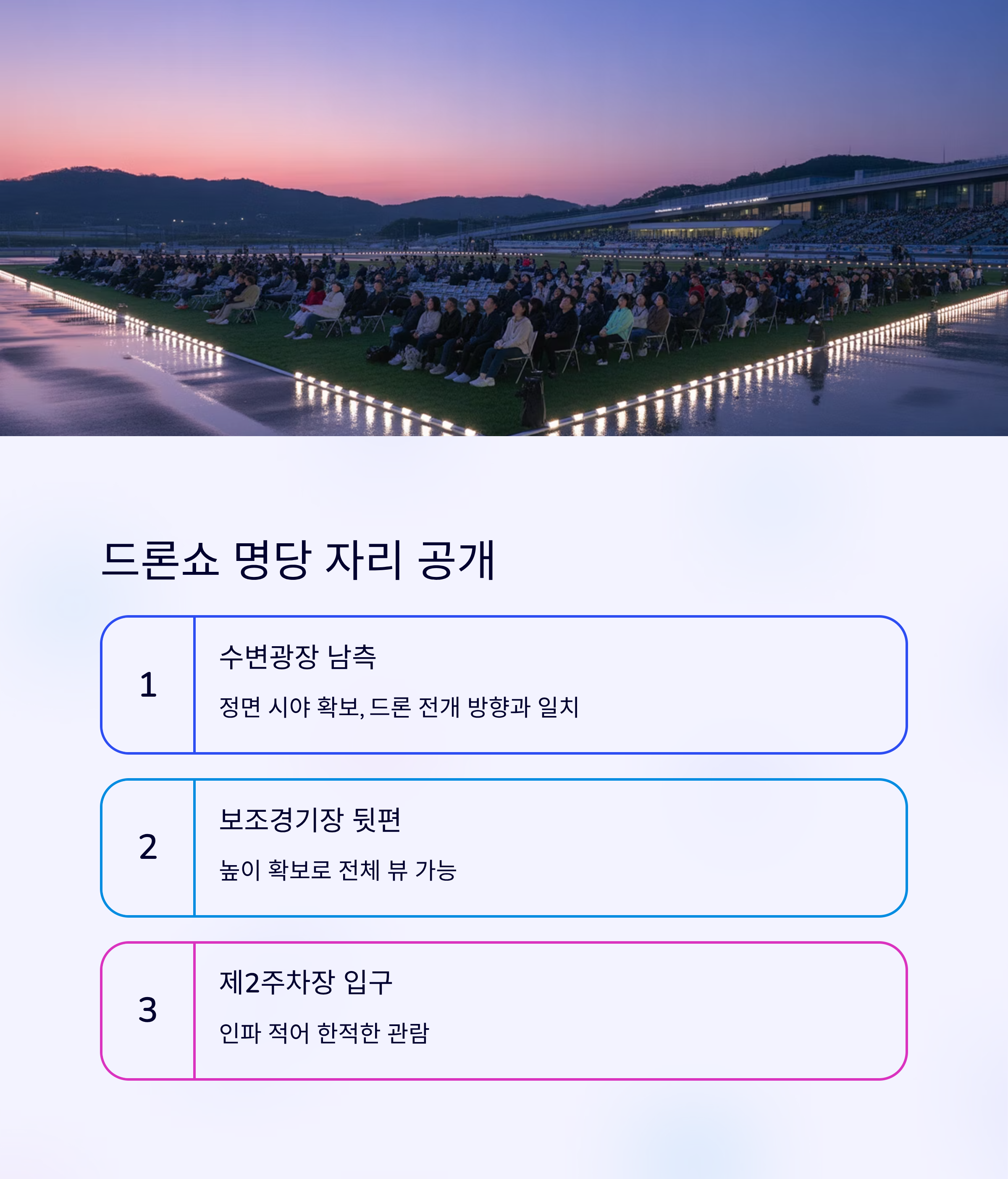 드론쇼 명당은 수변 무대 기준 남쪽 끝 벤치 라인과 보조경기장 뒷편 언덕입니다.