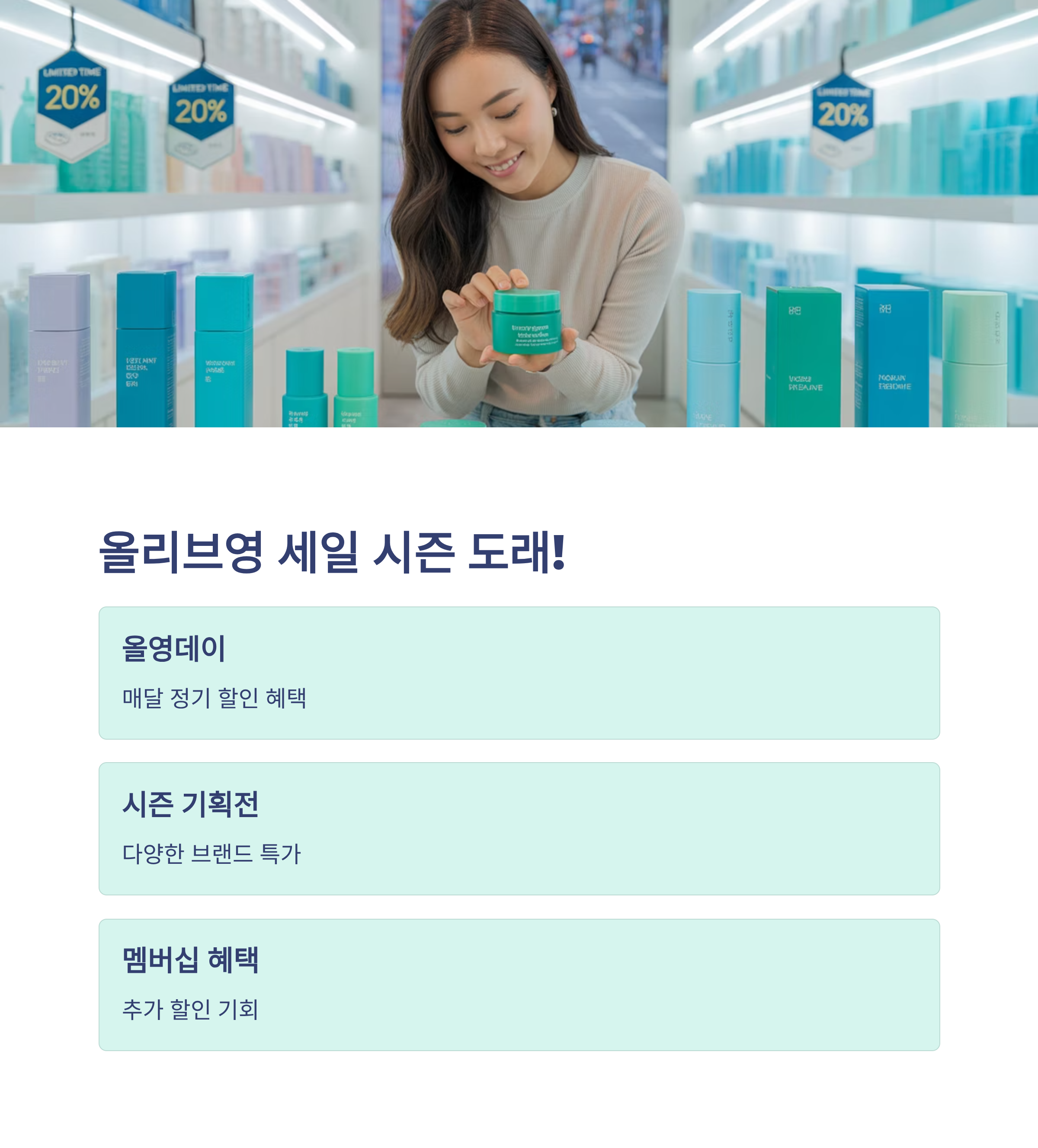 올리브영은 매달 말~익월 초를 기준으로 정기 세일을 진행하며, 2~3개월 간격으로 대형 프로모션이 열립니다.