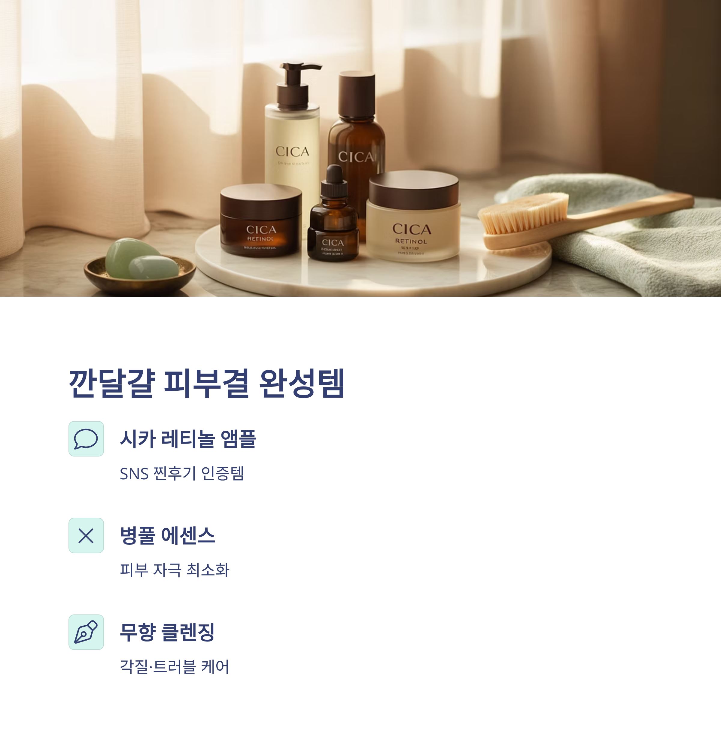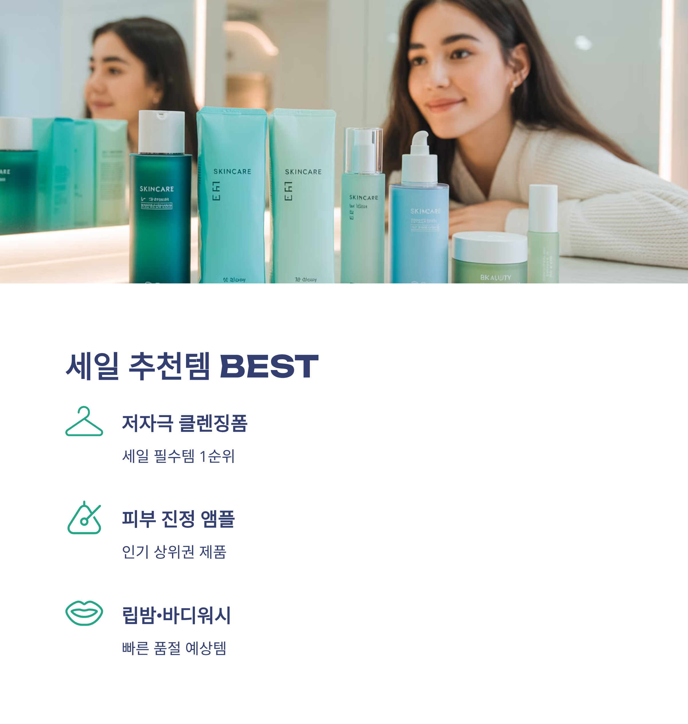 | 인기템 | 시카 앰플, 수분크림, 무향 클렌징 |