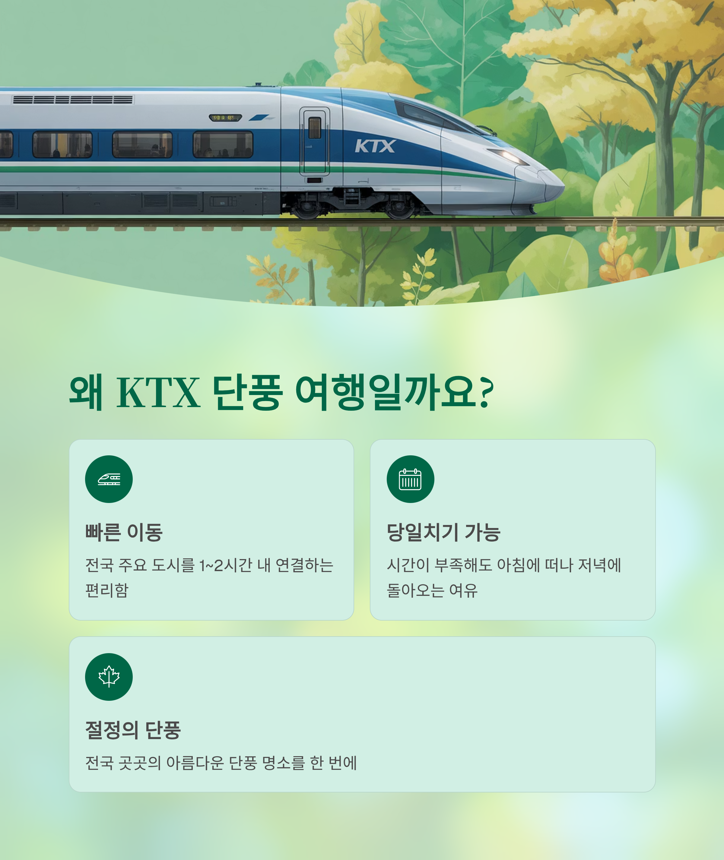 가을이 깊어지면 단풍이 절정을 맞이하죠. 멀리 떠나고는 싶지만, 시간이 부족한 분들께는 KTX가 최고의 친구가 됩니다. 빠르고 편리하게 전국 곳곳의 단풍 명소를 당일치기로 다녀올 수 있거든요. 오늘은 서울, 부산, 대전 등 주요 도시에서 KTX로 떠날 수 있는 아름다운 단풍 여행지를 소개해드릴게요.