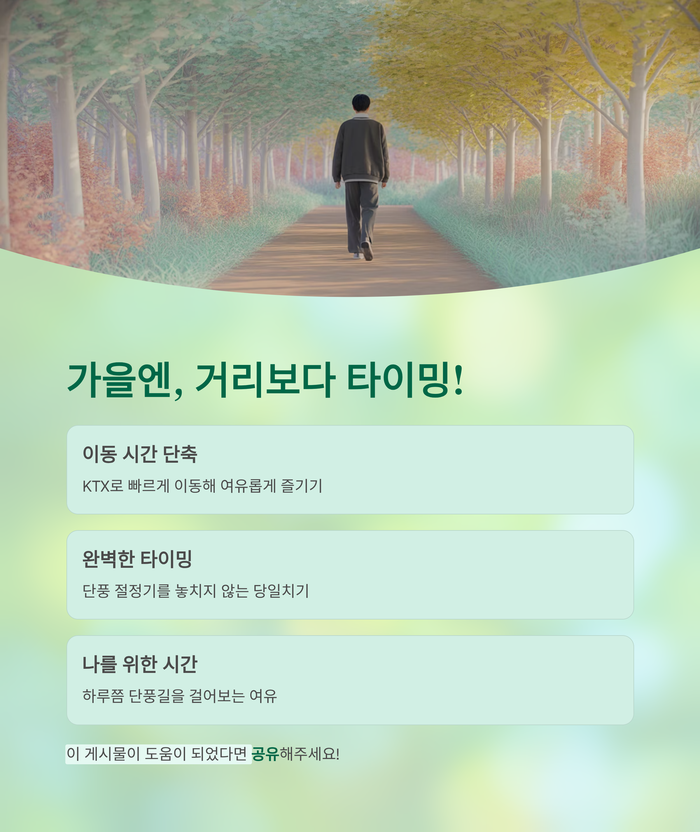 KTX를 이용하면 이동 시간을 줄일 수 있어 일찍 떠나고, 여유롭게 돌아올 수 있어요. 하루쯤은 나를 위해 단풍길을 걸어보는 것도 좋지 않을까요?
